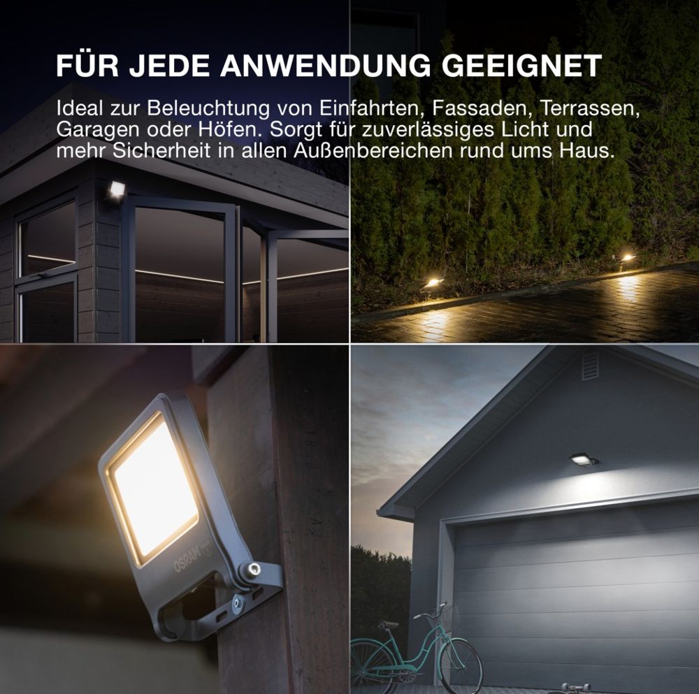 Anwendungsgebiete: Ersatz für Fluter mit Halogenlampen, Innenhöfe in Wohn- und Geschäftsbereichen, Gebäudefassaden und Sicherheit, Parkplätze und Unterführungen, Garagen, Öffentlicher Raum, Anstrahlung von Fassaden, Baustellen