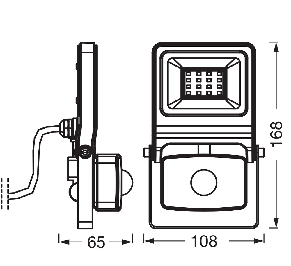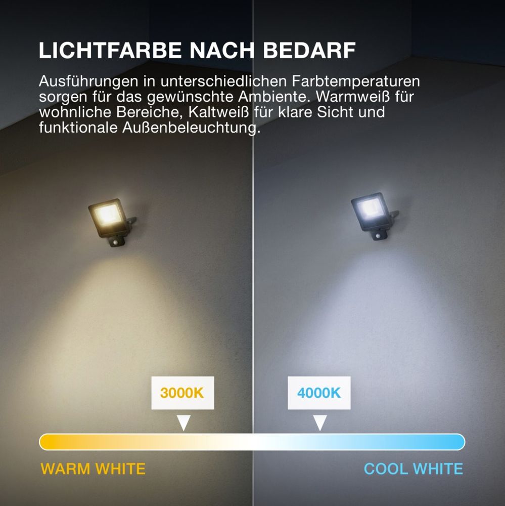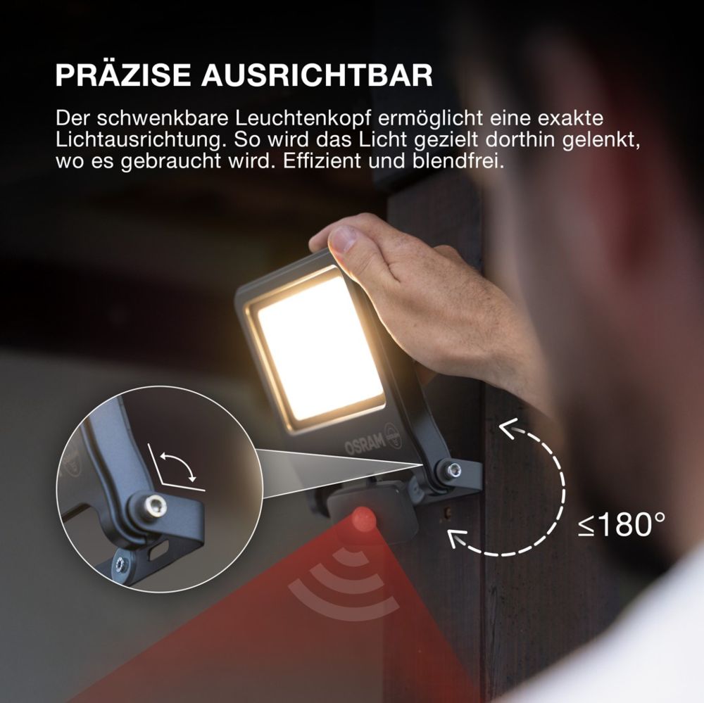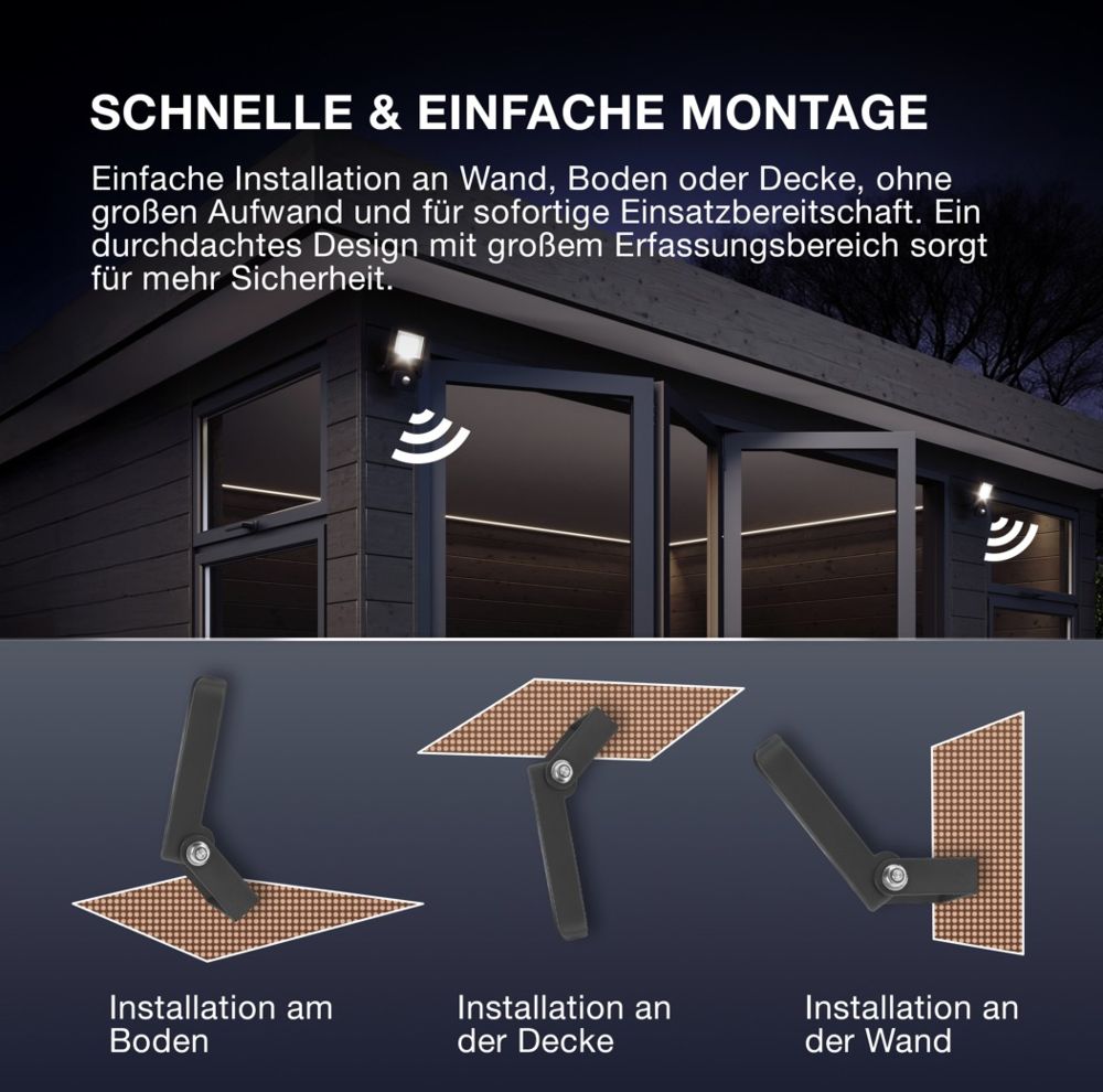 Der im Strahler eingebaute IR-Tageslicht- und Bewegungssensor kann je nach Bedarf eingestellt werden. Kabellänge: 1 m.