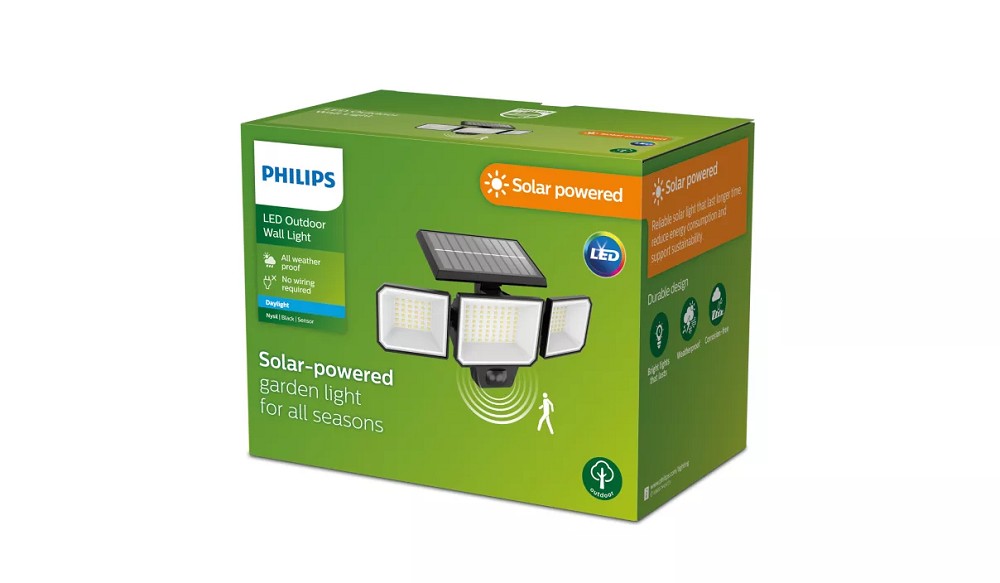 Die Philips Nysil Sicherheitsleuchte ist eine zuverlässige Solarleuchte mit einer längeren Nutzlebensdauer. Sie senkt den Energieverbrauch und ist ein Beitrag zur Nachhaltigkeit. Die Solar Wandleuchte Nysil ist ein Sicherheitslicht mit beweglichen Strahlerelementen auf den Seiten. Das hocheffiziente Solarpanel und der integrierte Tageslicht- und Bewegungssensor sorgen für hohe Helligkeit von 1000 Lumen bei erkannter Bewegung in 5000 Kelvin tageslichweisser Farbe. Bei voller Aufladung mit Sonnenenergie kann die Leuchte insgesamt rund 1 Stunde leuchten, das entspricht 180 Ein-/Aus Zyklen in der Dunkelheit.