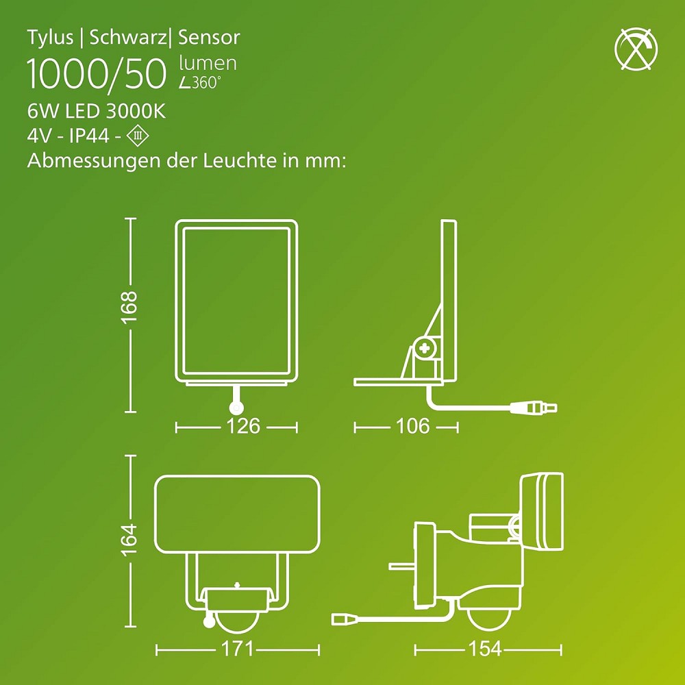 Lichtleistung 1000 Lumen (aktiv), 50 Lumen (Standby)
