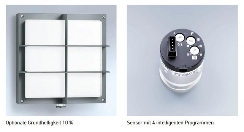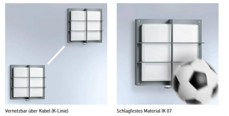 Die Außenwandleuchte L 691 S ist nicht nur schön, sondern auch energieeffizient. Die robuste, quadratische Leuchte mit 576 lm und nur 8,5 W ist noch heller als bisher, mit einer PMMA-Abdeckung aus schlagfestem Material. Zudem verfügt die Außenleuchte über ein stabiles Schutzgitter - für noch mehr Sicherheit. Mit 360°-Infrarot-Minisensor, 7 m Reichweite, Grundlicht, Softlichtstart, Zeit- und Dämmerungsschwelle. Per Kabel vernetzbar.