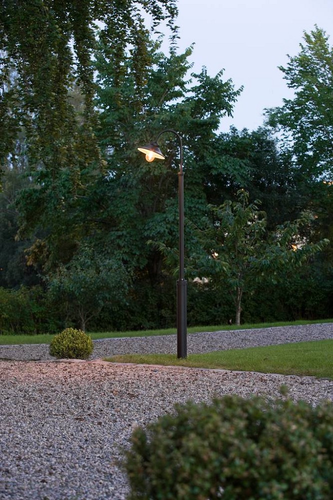 die Einfahrt zu einem Grundstück bzw. Anwesen geeignet. Die Mastleuchte besteht aus einem Lampenkopf mit einem schlichten zeitgenössischen Schirm. Die Verglasung besteht aus klarem Acrylglas und läßt einen Blick auf das Leuchtmittel zu und sorgt für eine optimale Ausleuchtung des Grundstückes. Wir empfehlen ein Filament LED-Leuchtmittel E27. Der moderne schlichte Stil der Mastleuchte lässt eine vielfältige Nutzung zu. Ob in der Hofeinfahrt oder am Weg des Grundstückes, diese Kandelaber macht in vielen Umgebungen eine sehr gute Figur.