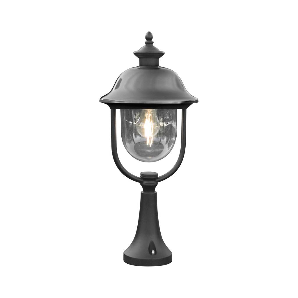 Die Sockelleuchte Parma ist eine klassisch anmutende Leuchte, die sich leicht in jeden Einrichtungsstil integrieren lässt. Sie hat ein schwarzes Design und ein Dach aus rostfreiem Stahl sowie einen Schirm aus klarem Glas für eine optimale Ausleuchtung.