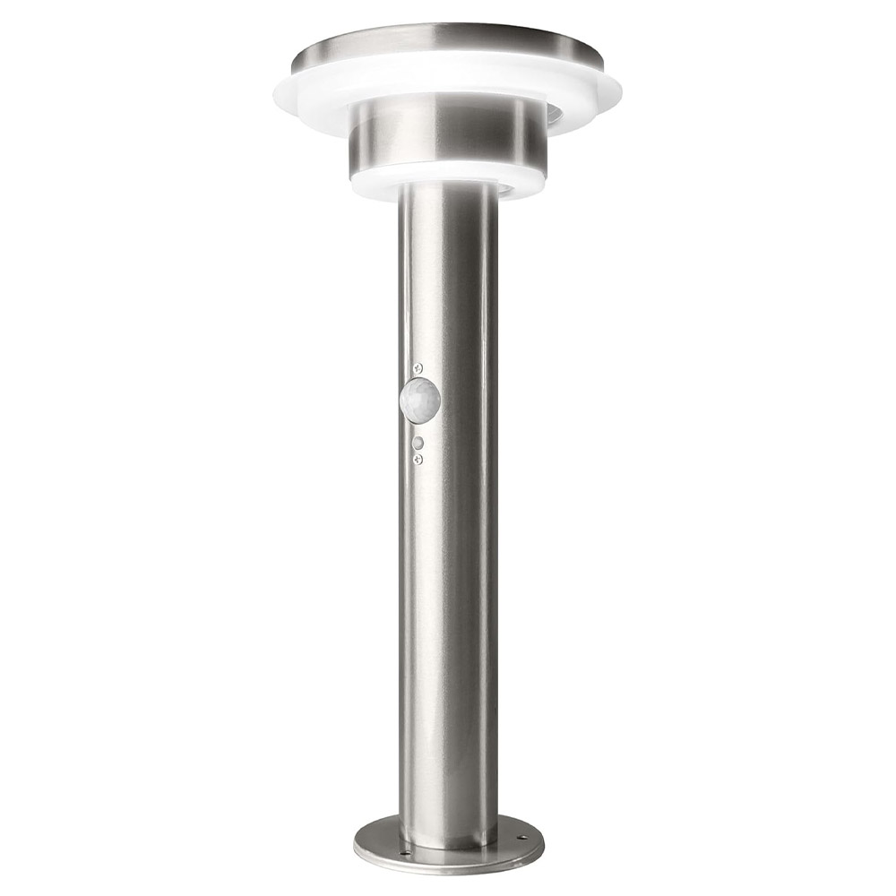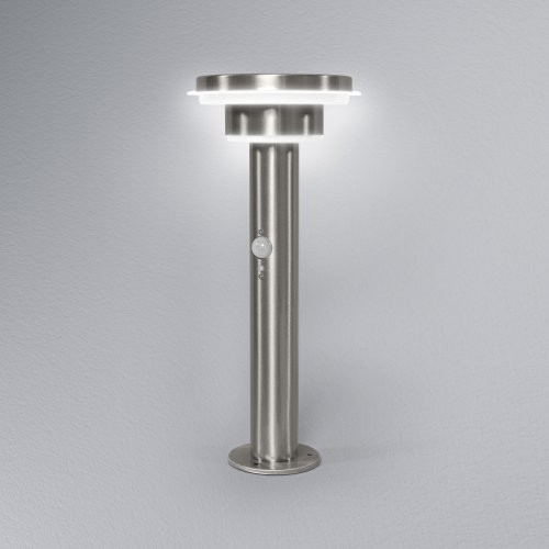 Die Solar Double Circle Höhe 40 cm metallic 1 flammig zylindrisch Solarleuchte aus Edelstahl und Kunststoff, die perfekt für den Außenbereich geeignet ist. Sie verfügt über Infrarotsensoren, die das Licht ausschalten, wenn niemand in der Nähe ist, und wieder einschalten, wenn sich jemand nähert.