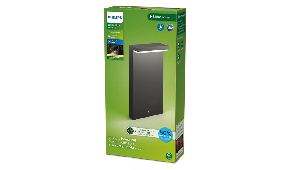Die Philips Bustan Ultra Efficient Leuchte kombiniert modernes Design mit maximaler Energieeinsparung. Sie verbraucht bis zu 80 % weniger Strom als herkömmliche LED-Außenleuchten und hält mehr als doppelt so lange – für nachhaltige Beleuchtung mit Stil.
