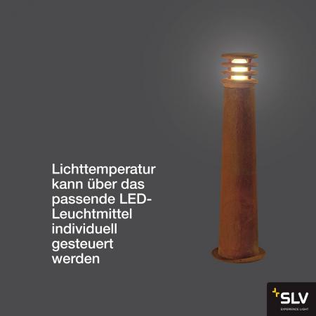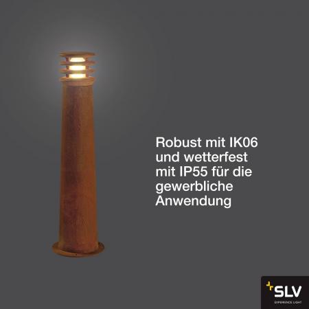 Die direkt abstrahlenden Stehleuchten der RUSTY Serie überzeugen durch Ihre außergewöhnliche Rostoptik. Diese wird durch eine spezielle chemische Behandlung des verwendeten FeCSi-Stahles erreicht. Dadurch wird die Leuchte zum Unikat und zur absoluten Besonderheit in jeder Installation. Durch Schutzart IP55 ist Sie für den Außenbereich geeignet. Optional ist ein Erdspieß sowie eine Verbindungsbox zum sicheren, elektrischem Anschluss im runden Leuchtenschaft verfügbar. Der elektrische Anschluss der zwei verfügbaren Versionen erfolgt jeweils an 230V Netzspannung.