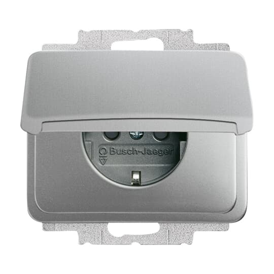 Mit Steckanschluss. 2-polig (2 P + E) Klappdeckel arretiert in geöffnetem Zustand.