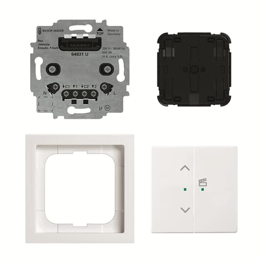 future® linear Jalousie-Einsatz mit Tastbedienelement, 2-fach, Wireless. Zum manuellen und automatisierten Steuern von Rollläden, Jalousien, Markisen. Zeitschaltuhr mit Astrofunktion. Zum Abspeichern und Aufrufen von Szenen und Gruppen über die rechte Wippe. Fernbedienbar via Bluetooth über Smartphone/Tablet App. Bestehend aus Flex-Jalousie-Einsatz, 64831 U. Bestehend aus Bedienelement flex, 2-fach, Wireless, 62721-WL. Bestehend aus Wippe, 2-fach links mit Symbol >Jalousie< 6232-20-84. Bestehend aus Wippe, 2-fach rechts mit Symbol >Szene< 6233-22-84. Bestehend aus future® linear-Abdeckrahmen, 1-fach 1721-184K. Nur in Verbindung mit handelsüblichen UP-Gerätedosen nach DIN 49073, montieren oder Busch-Jaeger Art.-Nr. 3040 UP-Dose Mauerwerk, 3050 UP-Dose Hohlwand oder 3060 UP-Dose Beton)