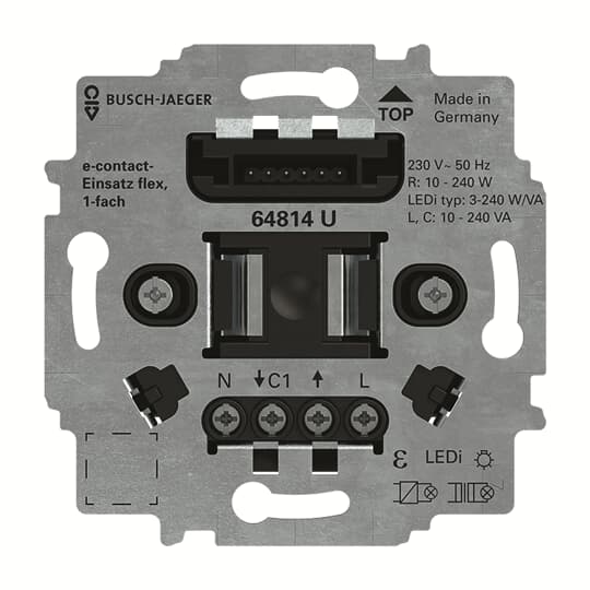2-Leiter-Anschlusstechnik (Neutralleiter nicht erforderlich). Neutralleiter optional anschließbar (beim Anschluss von geringen Lasten, < 10 W/VA, empfohlen). Zum Schalten von Beleuchtungsanlagen. Betrieb in Wechselschaltungen über Taster-Nebenstelle möglich. Bedienung auch über konventionelle Taster (2020 US, 2021/6 UK) möglich. Ohne Bedienelement. Für Bedienelement flex, 1-fach, 64711 und Wireless, 62711-WL. Für Bedienelement flex, 2-fach, 64721 und Wireless, 62721-WL. Für Busch-Komfortschalter® flex Bedienelement 64765-... . Für Busch-Wächter® 180 flex Sensoren 6476x-... . Für Busch-Wächter® 180 flex Sensoren, Wireless, 6276x-…-WL. Für Busch-Präsenzmelder flex Sensoren 6475x-... . Für Busch-Präsenzmelder flex Sensoren, Wireless 6275x-...-WL. Kombinierbar mit Nebenstellen-Einsatz flex, 64891 U. Nur dimmbare hochvolt LED's verwenden. Nur in Verbindung mit handelsüblichen UP-Gerätedosen nach DIN 49073, montieren oder Busch-Jaeger Art.-Nr. 3040 UP-Dose Mauerwerk, 3050 UP-Dose Hohlwand oder 3060 UP-Dose Beton)