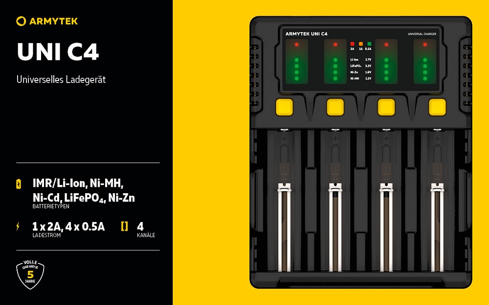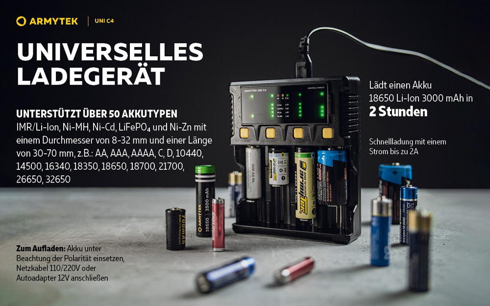 Das Armytek Uni C4 Ladegerät erkennt automatisch Batterietyp, Ladezustand und den optimalen Ladestrom. Bis zu vier unterschiedliche Akkus können gleichzeitig geladen werden, jeder Kanal lässt sich manuell über eine separate Taste steuern. Dank integrierter Sicherheitsfunktionen und LED-Anzeige mit Nachtmodus ist das Laden effizient, komfortabel und sicher. Ein Fahrzeugadapter ermöglicht zudem das Laden unterwegs.