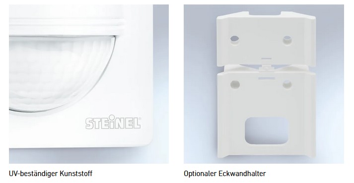 Schön, schlau, leistungsfähig. Infrarot-Bewegungsmelder IS 2180 ECO für außen, ideal für Gebäudefronten und Grundstücke, Betriebs- und Außenanlagen mittlerer Größe, ideal 2 m Montagehöhe, 180° Erfassungswinkel, Reichweite max. 12 m oder max. 5 m (tangential), Zeit- und Dämmerungsschwelle einstellbar, Dauerlicht-Betrieb, optionaler Eckwandhalter für Außen- und Inneneckmontage.