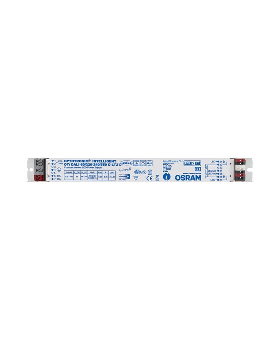 Elektrische Daten Nennleistung 60,00 W Nennausgangsleistung 6.4…60 W Nennspannung 220…240 V Nennausgangsspannung 54…240 V 1) Eingangsspannung AC 198…264 V 2) Eingangsspannung DC 176…276 V U-OUT (Arbeitsspannung) < 250 V Nennstrom 0,55 A Nennausgangsstrom 120…550 mA 3) Einschaltstrom 25 A 4) Ausgangsstromtoleranz ±3 % 5) Ausgangs-Rippelstrom (100 Hz) < 1 % Netzfrequenz 0/50/60 Hz Oberschwingungsgehalt < 10 % Netzleistungsfaktor λ > 0,95 6) EVG-Effizienz ≤93 % 7) Geräteverlustleistung 5 W 8) Max. Anz. EVG an Sicherungsaut. 10 A (B) 15 Max. Anz. EVG an Sicherungsaut. 16 A (B) 24 Max. Anz. EVG an Sicherungsaut. 25 A (B) 37 Stoßspannungsfestigkeit (L/N – Erde) 2 kV Stoßspannungsfestigkeit (L – N) 1 kV Galvanische Trennung Nicht isoliert Verlustleistung im Stand-By-Betrieb < 0.25 W Flimmer-Messgröße (Pst LM) ≤1 1) Maximal 250 V 2) Zulässiger Spannungsbereich 3) ±5% 4) Bei 280 µs 5) Bei Verwendung von DALI 6) Volllast bei 230 V 7) Bei Volllast und 230 V 8) Maximum Photometrische Daten Flimmer-Messgröße (Pst LM) ≤1 Messgröße für Stro-boskop-Effekte (SVM) ≤0.4 Maße & Gewicht Länge 280,00 mm Lochmaßabstand Länge 270,0 mm Breite 30.00 mm Höhe 21.00 mm Leitungsquerschnitt eingangsseitig 0.5…1.5 mm² 1) Leitungsquerschnitt ausgangsseitig 0.5…1.5 mm² 1) Abisolierlänge eingangsseitig 8.5…9.5 mm Abisolierlänge ausgangsseitig 8.5…9.5 mm Produktgewicht 205,00 g 1) Massive oder flexible Adern Farben & Materialien Produktfarbe Weiß Gehäuse Metall Gehäusematerial Metall Temperaturen & Betriebsbedingungen Umgebungstemperaturbereich -25…+60 °C Maximale Temperatur am Messpunkt tc 75 °C Max. Gehäusetemperatur im Fehlerfall 110 °C Zulässige rel. Luftfeuchte beim Betrieb 5…85 % 1) 1) max. 56 d/y bei 85% Lebensdauer EVG Lebensdauer 50000 h, 100000 h 1) 1) Bei maximum Tc = 75°C / 10% Ausfallrate / Bei Tc = 65 °C / 10 % Ausfallrate Zusätzliche Produktdaten Gekapselt Nein Einsatzmöglichkeiten Dimmbar Ja DIM-Schnittstelle DALI-2, Touch DIM, Touch DIM Sensor Dimmbereich 1…100 % 1) Übertemperaturschutz Automatisch reversibel Überlastschutz Automatisch reversibel Kurzschlussschutz Automatisch reversibel Leerlauffestigkeit Ja Maximale Leitungslänge EVG/Lampe REM 2,0 m Geeignet für Leuchten mit Schutzklasse I Geeignet für Notlicht Ja Anschlussart ausgangsseitig Federkraftklemme 1) Für maximalen Nennausgangsstrom Zertifikate & Standards Prüfzeichen - Zulassung CE, EL, ENEC 10, VDE-EMC, CCC, RCM Normen Gemäß EN 61347-1, Gemäß EN 61347-2-13, Gemäß EN 55015, Gemäß EN 61547, Gemäß EN 61000-3-2, Gemäß EN 62384, Gemäß EN 62386 Schutzklasse I Schutzart IP20