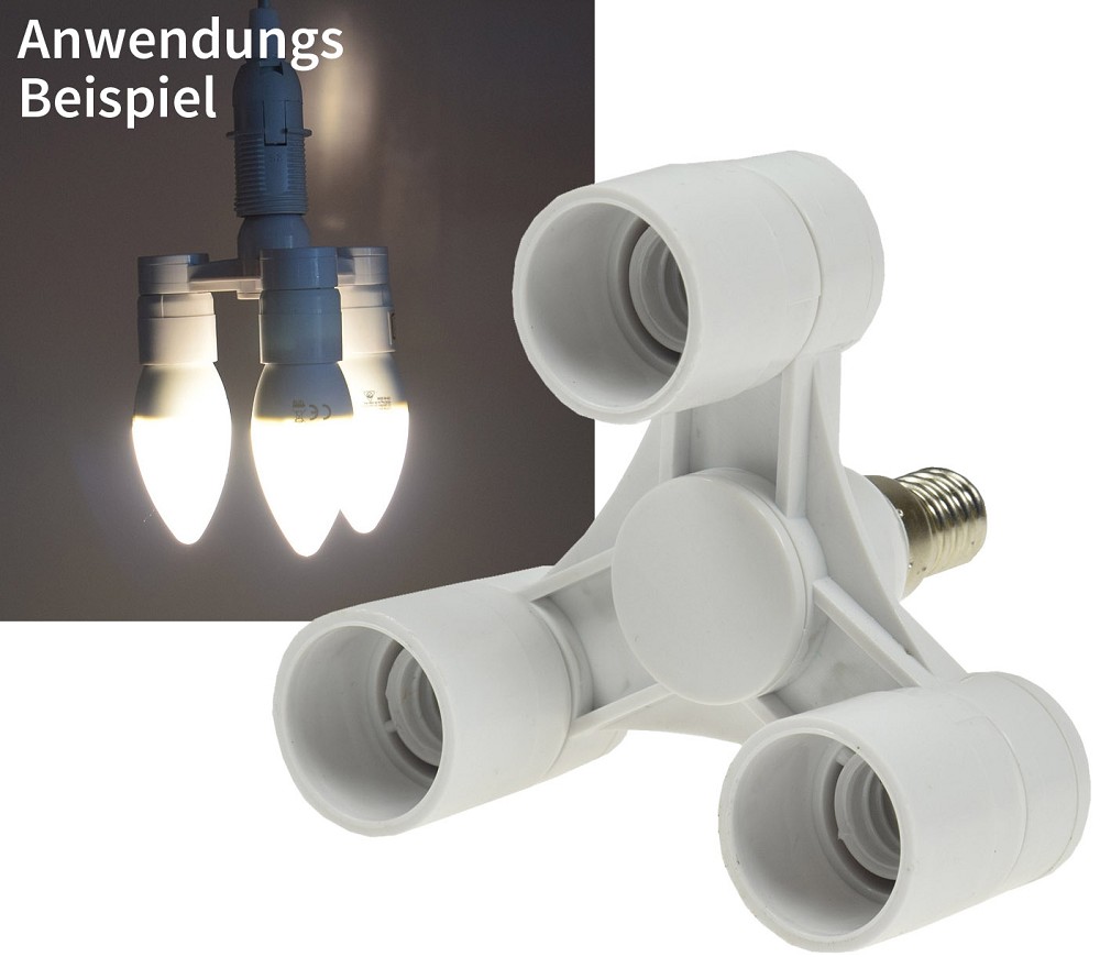 Praktischer 3-fach Adapter für E14 Leuchtmittel.• max 40Watt je Sockel• ØxH 97x90mmDokumente