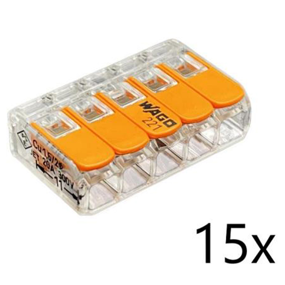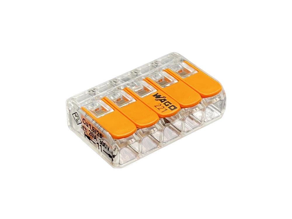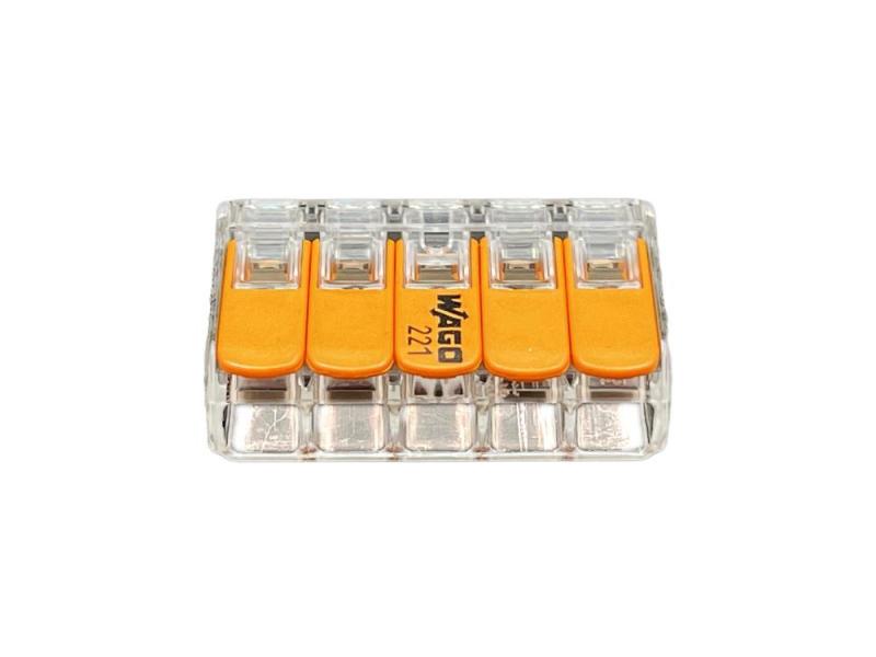 COMPACT-Verbindungsklemme für alle Leiterarten, 5-Leiter-Klemme, mit Betätigungshebeln, max. Dauergebrauchstemperatur 85°C.