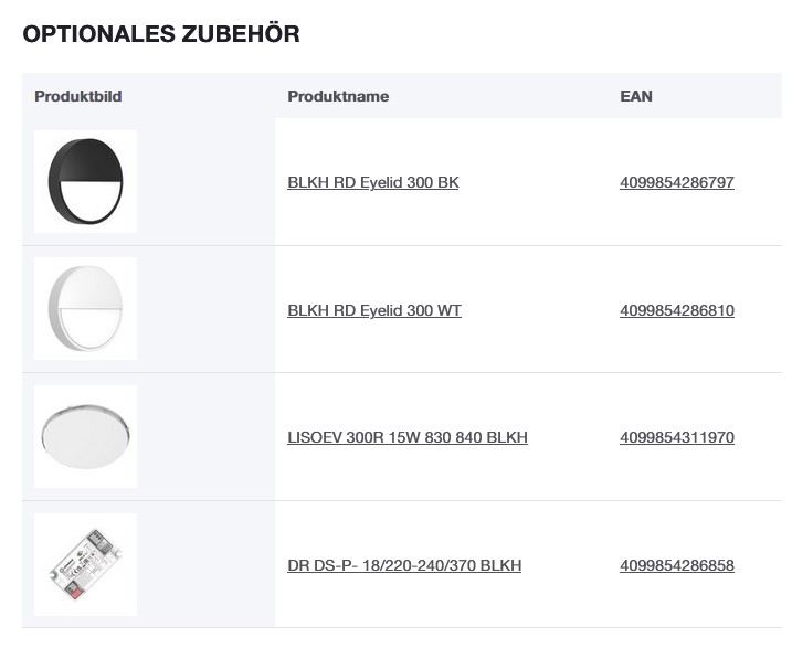 1) Für mögliche Optionen siehe Lumen-/Wattagen- Übersichtsdarstellung