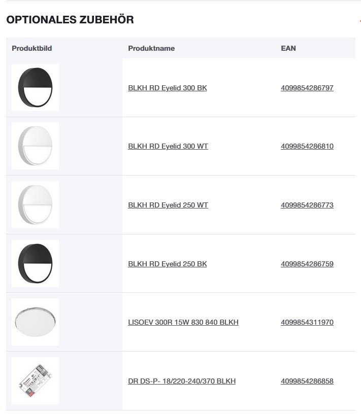 1) Für mögliche Optionen siehe Lumen-/Wattagen- Übersichtsdarstellung