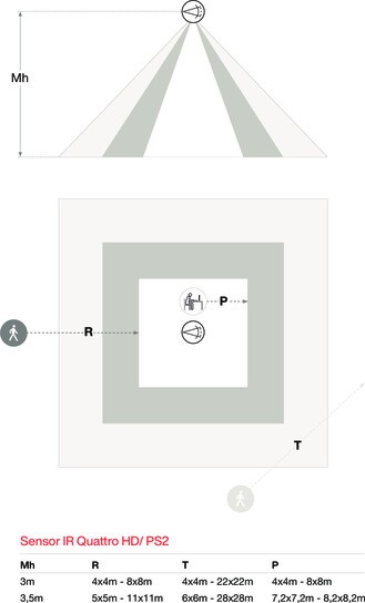 Erfassungsbereich radial min./max. 5x 5m/11x 11m, tangential min./max. 6x 6m/28x 28m