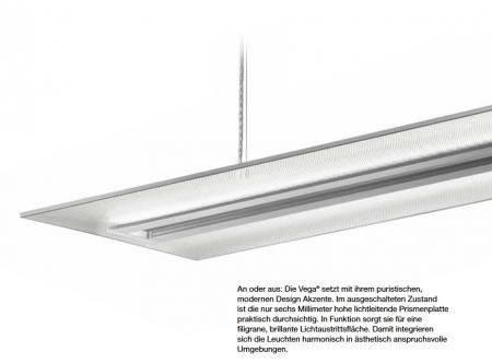 Die Vega® wurde speziell für modernen erfolgreichen Lichteinsatz in klassischen Bürobereichen entwickelt. Dank der speziellen Licht - Charakteristik und der guten Entblendung kann die Vega® auch direkt über dem Arbeitsplatz platziert werden. Besondere Wirkung entfalten die Leuchten aber auch in repräsentativen Umgebungen wie Foyers, Lounges, Empfangsbereichen, Theken oder Besprechungsräumen, auch in Bildungseinrichtungen, Schulen, Bibliotheken oder öffentlichen Gebäuden.