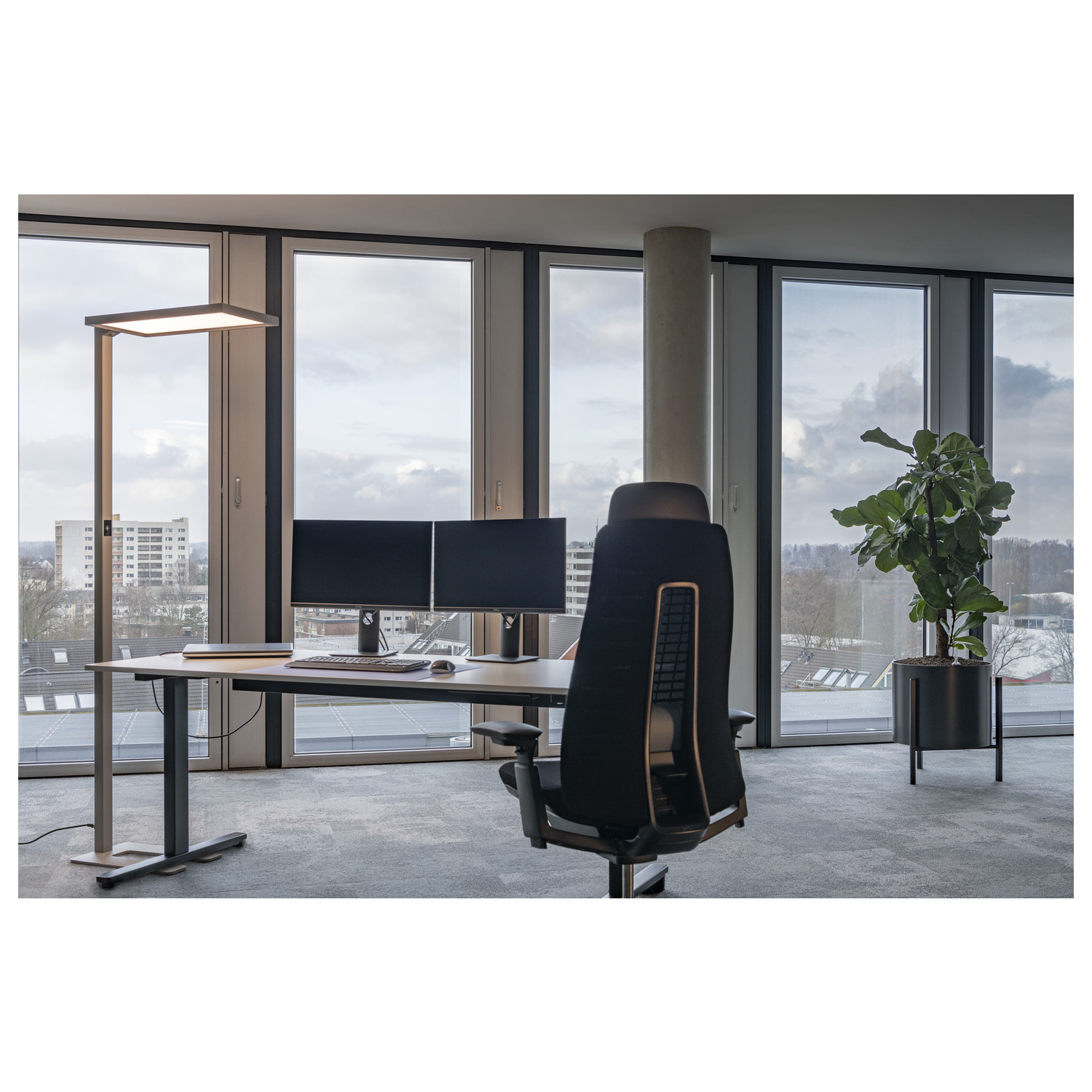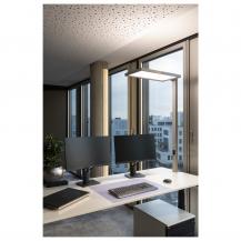 Die silberne WORKLIGHT FL wird allen Anforderungen einer modernen Arbeitsplatzbeleuchtung gerecht. Durch das eingebaute LED-Leuchtmittel, 7600 Lumen, UGR ≤ 19 und 4000 Kelvin erzeugt die Stehleuchte ein neutralweißes und blendfreies Licht, das die Konzentration fördert. Dazu kommen der Bewegungssensor, die Tageslichtsteuerung sowie stufenlose Dimmbarkeit. Durch den integrierten Treiber sowie der Zuleitung inklusive Stecker, lässt sich die WORKLIGHT FL direkt anschließen. Dazu ist sie mit ihrer LED Lebensdauer von 50000 Stunden auch noch äußerst langlebig.