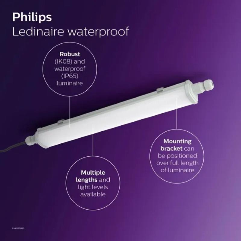 Die Feuchtraumleuchte WT060C aus der Philips Ledinaire-Serie ist eine zuverlässige, effektive und energieeffiziente Lösung für die Beleuchtung von trockenen und feuchten Umgebungen im öffentlichen Bereich sowie in privaten Bereichen wie Kellern, Parkplätzen, Werkstätten und Waschräumen. Das mitgelieferte Montagematerial ermöglicht die Verwendung dieser Leuchte für den Anbau oder die Befestigung an einer Abhängung (nicht im Lieferumfang enthalten). Das schlagfeste und spritzwassergeschützte Polycarbonat-Gehäuse sorgt für einen effektiven Schutz der integrierten LEDs.