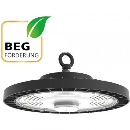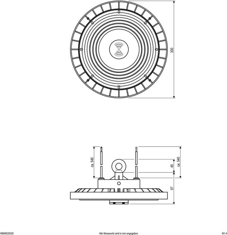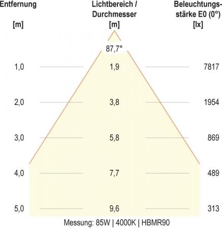 Hallenbeleuchtung mit extrem hoher Lichtausbeute für gewerbliche Anwendungen. Die Leuchte hat eine 0,5m lange Anschlussleitung mit freien Aderenden. Der Ausstrahlwinkel der Leuchte beträgt 120°. Die Leuchte besitzt rückseitig eine Öse zur Aufnahme einer Seilabhängung. Die Leuchte kann auch mit einer Eingangsspannung von 176-276V/DC betrieben werden. Der Strahler verfügt über einen Überspannungsschutz von 6kV. Für unterschiedliche Anforderungen ist folgendes Zubehör optional erhältlich: HBM65BM (Dämmerungs- und Bewegungsmelder), HBM65BMHS (Handsender für den Sensor) und HBMD110 (0-10V zu Dali Konverter).Die Leuchte verfügt über zwei Dip-Schalter mit denen die Leistung und die Lichtfarbe eingestellt werden kann. Die möglichen Farbtemperaturen und daraus resultierenden Lumen unter Berücksichtigung der einstellbaren Wattage sind: 85W: 4000K (14.785lm, 175lm/W) und 5000K (14.450lm, 170lm/W), 100W: 4000K (17.000lm, 170lm/W) und 5000K (16.500lm, 165lm/W), 150W: 4000K (24.750lm, 165lm/W), 5000K (24.000lm, 160lm/W), 200W: 4000K (32.000lm, 160lm/W), 5000K (30.000lm, 150lm/W). Die Leuchte ist auch für Dauereinsatz geeignet. L80B10 bei 50.000h.