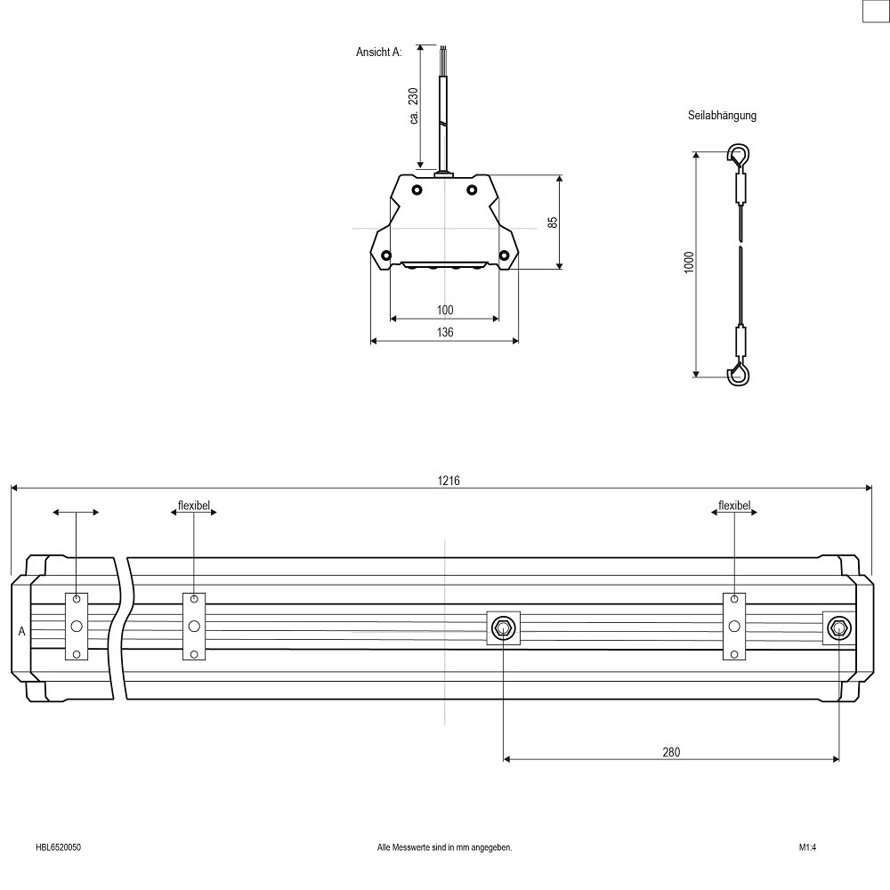 Hallenbeleuchtung mit extrem hoher Lichtausbeute für gewerbliche Anwendungen. Die Leuchte hat eine 23cm lange Anschlussleitung für den Hochvoltanschluss, sowie eine 23cm lange Anschlussleitung für die DALI-Schnittstelle. Im Lieferumfang sind drei, jeweils 1m lange, Seilabhängungen bereits enthalten. Das DALI-fähige Netzgerät ist in der Leuchte verbaut. Der Strahler verfügt über einen Überspannungsschutz von 4kV. Technische Daten: ta: -40°C - 55°C.