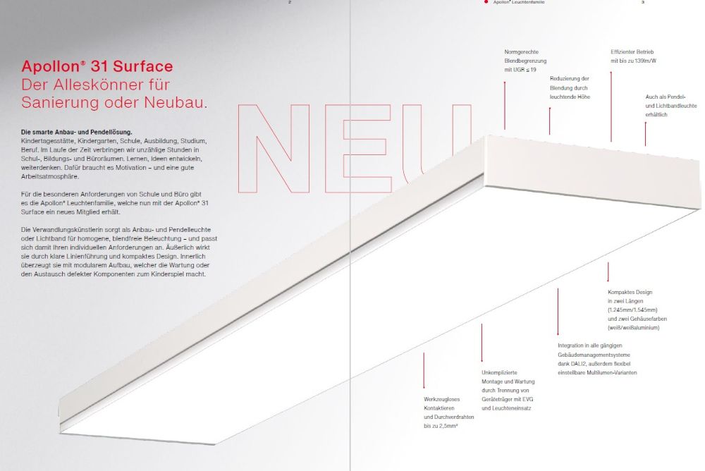 Die Apollon® Familie überzeugt durch ihr integratives Design, eine homogene Ausleuchtung und fortschrittliche Technik. Die vielfältige Leuchtenfamilie ist dank unterschiedlicher Geometrien und Montagevarianten perfekt für das komplette Bürogebäude. Die Apollon® 31 Surface besticht durch eine lange Lebensdauer und ihre hochwertige Metallausführung. Eine Schnellinstallation ist durch optimierte Anschlusstechnik möglich.