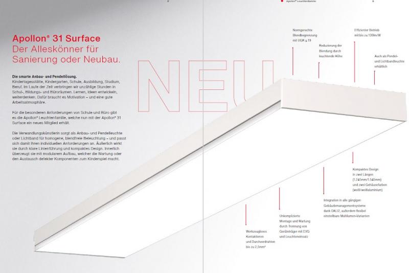 Die Apollon® Familie überzeugt durch ihr integratives Design, eine homogene Ausleuchtung und fortschrittliche Technik. Die vielfältige Leuchtenfamilie ist dank unterschiedlicher Geometrien und Montagevarianten perfekt für das komplette Bürogebäude. Die Apollon® 31 Surface besticht durch eine lange Lebensdauer und ihre hochwertige Metallausführung. Eine Schnellinstallation ist durch optimierte Anschlusstechnik möglich.
