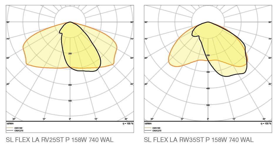 Breite Leuchtdichteverteilung optimiert für breitere Strassen und Flächenbeleuchtung