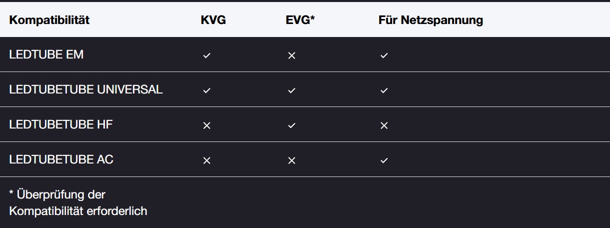 Diese Prüfung bitte sorgfältig durchführen. Suchen Sie nun in der Kompatibilitätslisten nach Ihrem Vorschaltgerät und einer dazu passenden EVG-Röhre.
