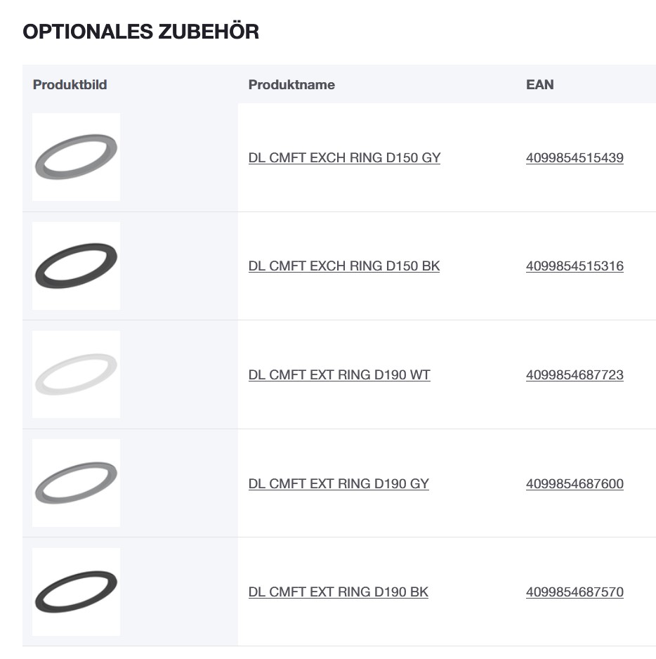 - Erweiterungsring D190 zum Nachrüsten der Leuchtenversion D150 für Deckenausschnitte von 150-175 mm