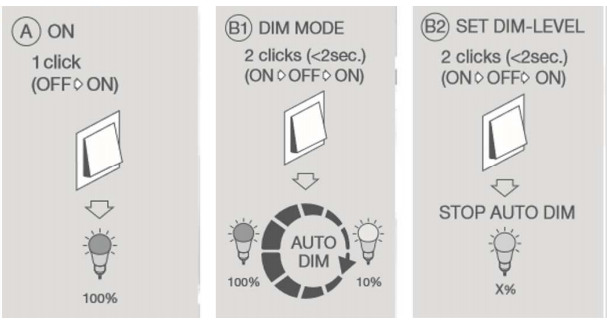 - Bei einem Doppelklick innerhalb 2 Sekunden (An-Aus-An) beginnt die Lampe von 100% Helligkeit auf 10% zu Dimmen. Anschließend dimmt die Lampe wieder von 10% auf 100%.
