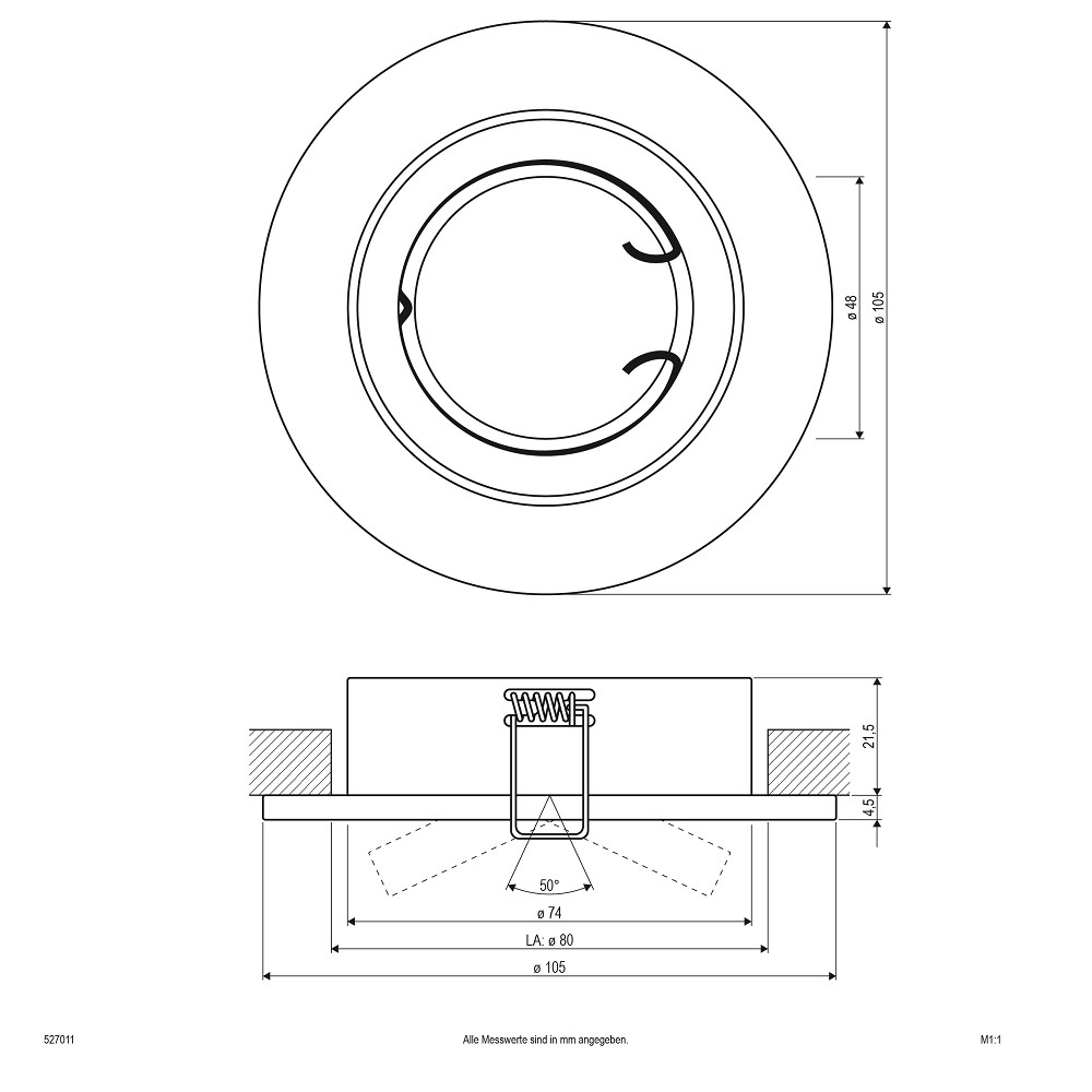 Schwenkbare Deckeneinbauleuchte für vielfältige Anwendungen im Innenbereich. Sowohl Effektbeleuchtungen, Raumbeleuchtung, Akzentuierte Beleuchtung und vieles mehr, lassen sich mit dieser Leuchte umsetzten. Durch die Hochvoltfassung lassen sich verschiedene Leuchtmittel für die Unterschiedlichsten Beleuchtungsanforderungen in die Leuchte einsetzen, wodurch der Gestaltungsmöglichkeit nahezu keine Grenzen gesetzt sind. Da die Leuchte direkt an die 230V-Zuleitung angeschlossen werden kann, entfallen zusätzliche Kosten für Betriebsgeräte. Lieferung erfolgt inkl. Distanzbügel. Der Schwenkbereich der Leuchte beträgt 25°.