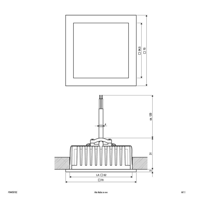 Deckeneinbauleuchte für vielfältige Anwendungen im Innenbereich. Sowohl Effektbeleuchtungen, Akzentuierte Beleuchtung und vieles mehr, lassen sich mit dieser Leuchte umsetzten. Dank des fest verbauten LED-Chips entfallen zusätzliche Kosten für Leuchtmittel. Es können mehrere Leuchten über ein Betriebsgerät betrieben werden, wodurch sich verschiedene Lichtgruppen innerhalb eines Raums schalten lassen. Da die Leuchte über 350mA betrieben wird, sind die Leuchten in Reihe zu schalten. Die Leuchte verfügt über eine 0,15m lange Anschlussleitung.