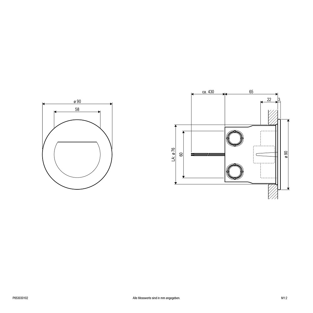 LED Wandeinbauleuchte für die verschiedensten Anwendungen im Innen- und Außenbereich. Um einen Blendeffekt zu vermeiden erfolgt der Lichtaustritt indirekt über den weißen Reflektor. Die Leuchte kann auch mit der mitgelieferten Kunststoff-Einbauhülse montiert werden, der benötigte Lochausschnitt beträgt in diesem Fall 76mm und die Einbautiefe 65mm. Durch die Verwendung der Einbauhülse wird z. B. die Montage in massivem Mauerwerk deutlich erleichtert. Da die Leuchte über 350mA betrieben wird, sind die Leuchten in Reihe zu schalten.
