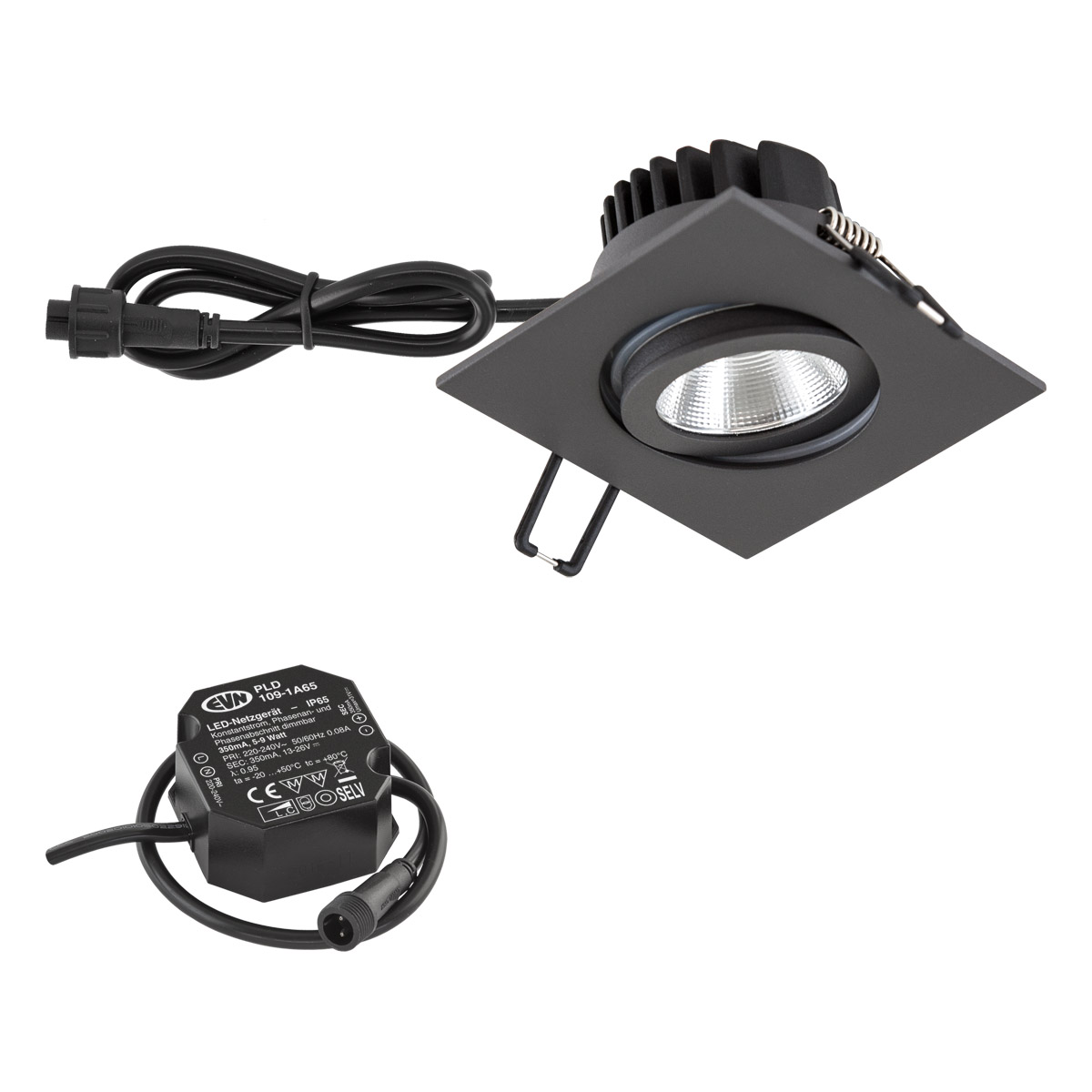 Mit der COB-LED Deckeneinbauleuchte lassen sich vielfältige Anwendungen im Innenbereich, wie z. B. Effektbeleuchtung, Raumbeleuchtung, Akzentuierte Beleuchtung und vieles mehr realisieren. Beim Einbau in geschlossene Decken erreicht die Leuchte die Schutzart IP65. Aufgrund dessen kann die Leuchte natürlich ebenso für Feuchtraum-Anwendungen und im Außenbereich eingesetzt werden. Zusätzliche Kosten für Leuchtmittel entfallen bei dieser Leuchte, da die Leistung von einem fest verbauten LED-Chip geliefert wird. Da im Lieferumfang das Netzgerät bereits enthalten ist, fallen auch hierfür keine zusätzlichen Kosten an. Der Schwenkwinkel beträgt 20°, Gehäusefarbe ähnlich RAL7016. tc: 75°C.