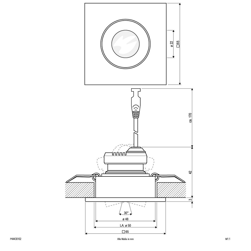 Mit der LED Deckeneinbauleuchte lassen sich vielfältige Anwendungen im Innenbereich, wie z. B. Effektbeleuchtung, Raumbeleuchtung, Akzentuierte Beleuchtung und vieles mehr realisieren. Aufgrund der gegebenen Schutzart kann die Leuchte auch im Feuchtraum und sogar im geschützten Außenbereich verbaut werden. Zusätzliche Kosten für Leuchtmittel entfallen bei dieser Leuchte, da die Leistung von einem fest verbauten LED-Chip geliefert wird. An der Leuchte befindet sich eine 1m lange Anschlussleitung. Der Schwenkwinkel beträgt 15°.