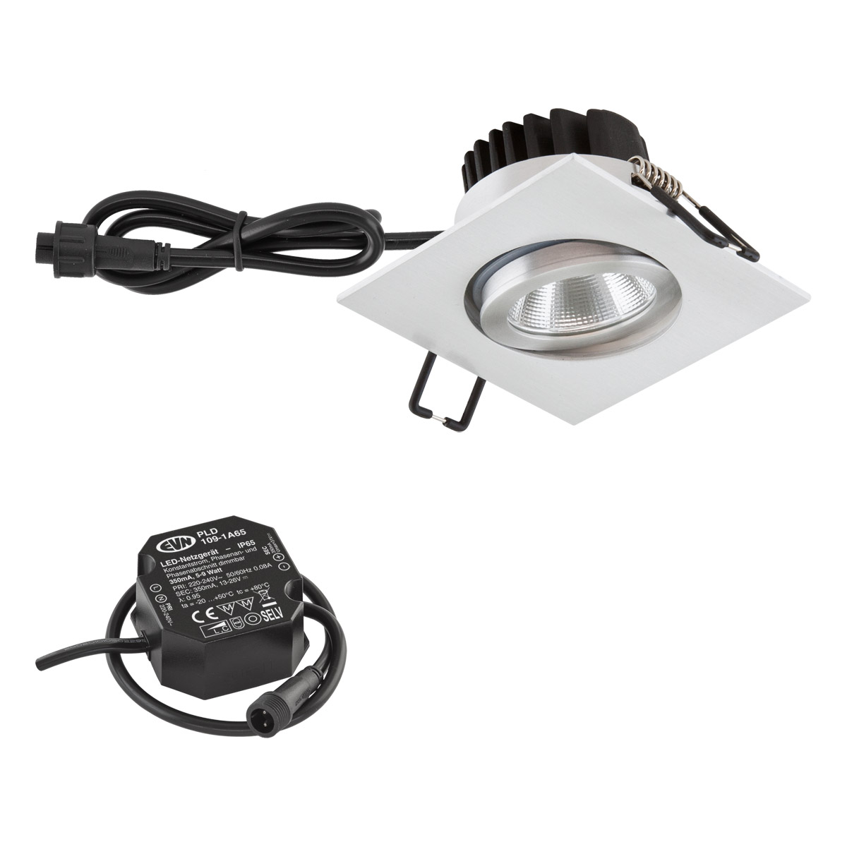 Mit der COB-LED Deckeneinbauleuchte lassen sich vielfältige Anwendungen im Innenbereich, wie z. B. Effektbeleuchtung, Raumbeleuchtung, Akzentuierte Beleuchtung und vieles mehr realisieren. Beim Einbau in geschlossene Decken erreicht die Leuchte die Schutzart IP65. Aufgrund dessen kann die Leuchte natürlich ebenso für Feuchtraum-Anwendungen und im Außenbereich eingesetzt werden. Zusätzliche Kosten für Leuchtmittel entfallen bei dieser Leuchte, da die Leistung von einem fest verbauten LED-Chip geliefert wird. Da im Lieferumfang das Netzgerät bereits enthalten ist, fallen auch hierfür keine zusätzlichen Kosten an. Der Schwenkwinkel beträgt 20°. tc: 75°C.