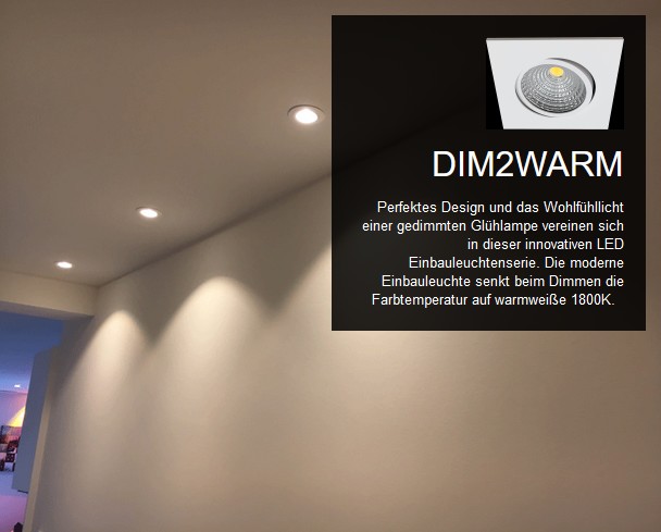 SLIM DIM2WARM - perfektes Design und das Wohlfühllicht einer Glühlampe vereinen sich in dieser innovativen LED Einbauleuchtenserie. Die moderne Einbauleuchte mit DIM2WARM LED Modul senkt beim Dimmen die Farbtemperatur von 2700K auf angenehm warmweiße 1800K. Das verbaute Modul kann durch einen authorisierten Fachbetrieb gewechselt werden. Die Leuchte ist bis zu 90° schwenkbar.