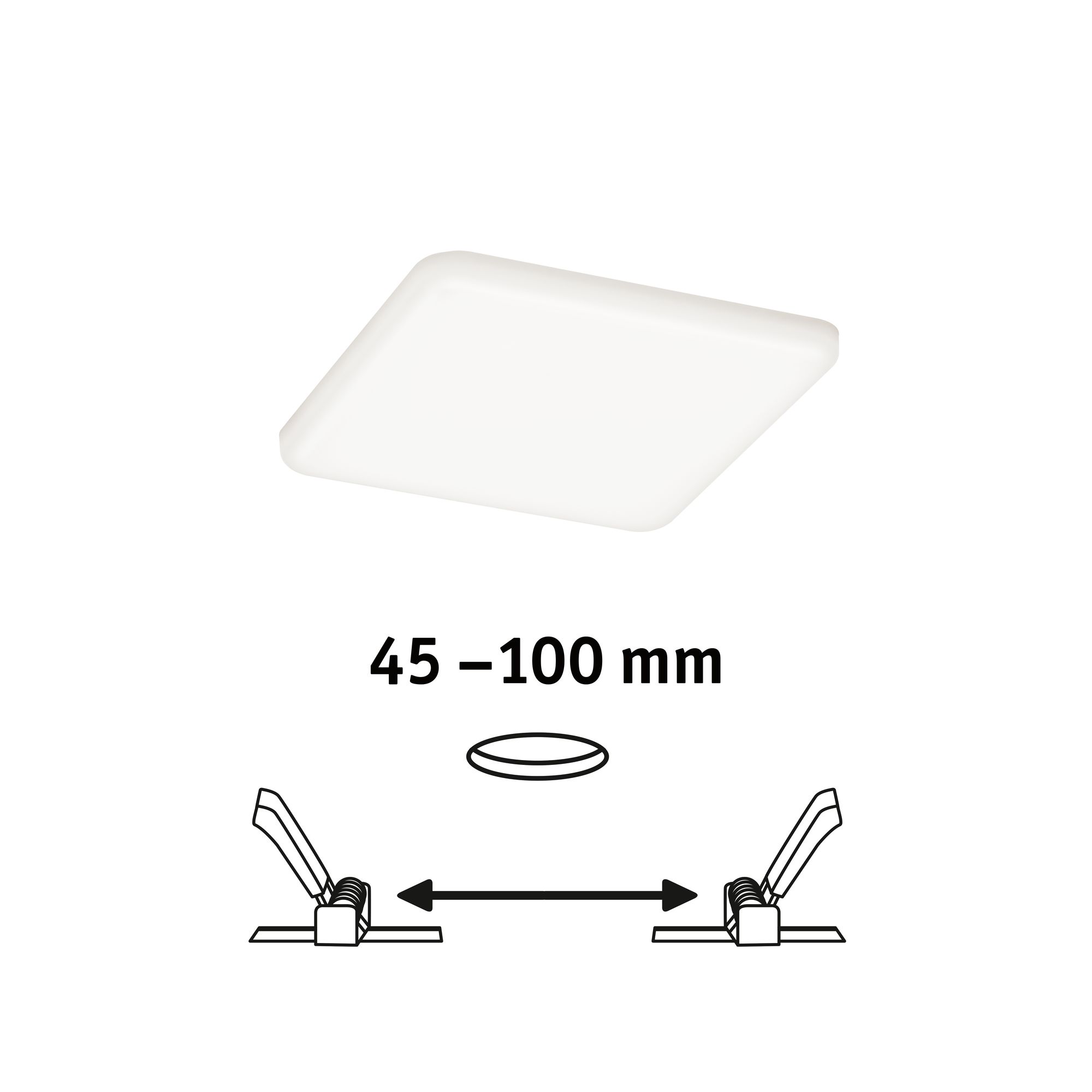 Das rahmenlose Veluna Panel mit einer Leistung von 8,5 Watt sorgt für flächiges neutralweißes Licht. Dank flexibler VariFit-Technik lassen Sie sich Klemmfedern für den Einbau stufenlos zwischen 45 und 100 mm einstellen. Damit kann das Panel sowohl in bereits vorhandene Bohrlöcher als auch in neue mit Standard Bohrkrone eingebaut werden.