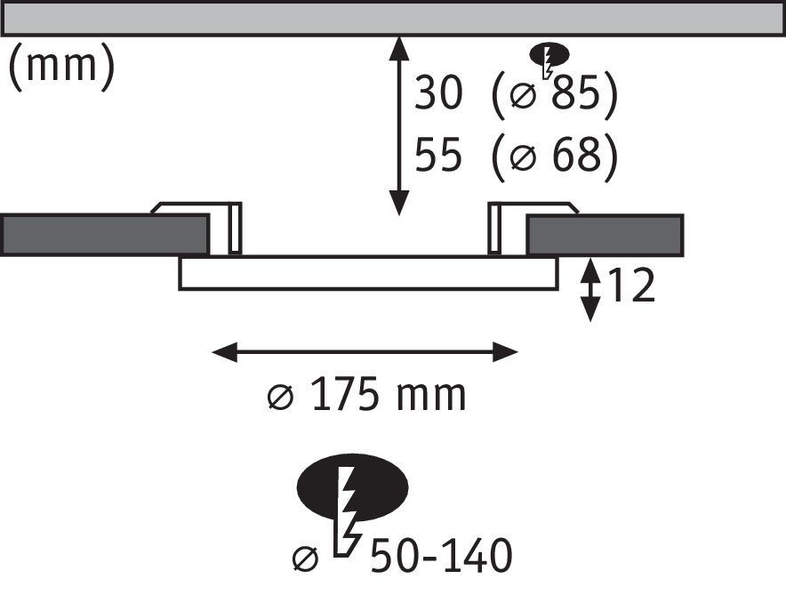 ALLGEMEINE INFORMATIONEN Wohnraum: jeder Wohnraum Form: rund IP Schutz: IP44 Schutzklasse: Schutzklasse II Dimmbar: Ja Dimmen: mit normalem Lichtschalter 3 step dimmbar Technik: LED Energieeffizienzklasse: A++ - A ABMESSUNGEN & GEWICHT Höhe (mm): 12 Gewicht netto (g): 325 Gewicht brutto (g): 419 Ø (mm): 175 Einbauöffnung (mm): 50 Einbautiefe (mm): 70 Hohlraumtiefe (mm): 30-55 LICHTTECHNISCHE DATEN Bestückung (W): 13 Spannung (V): 230 Farbtemperatur Bereich (K): 3000 Lebensdauer (h): 30000 Inklusive Leuchtmittel: Ja Nennlichtstrom (lm): 1300 Farbwiedergabeindex (Ra): > 80 Entspricht Glühlampe: 115 W FARBEN & MATERIALIEN Material: Kunststoff BESONDERHEIT