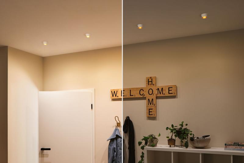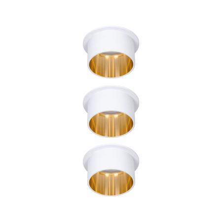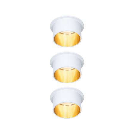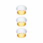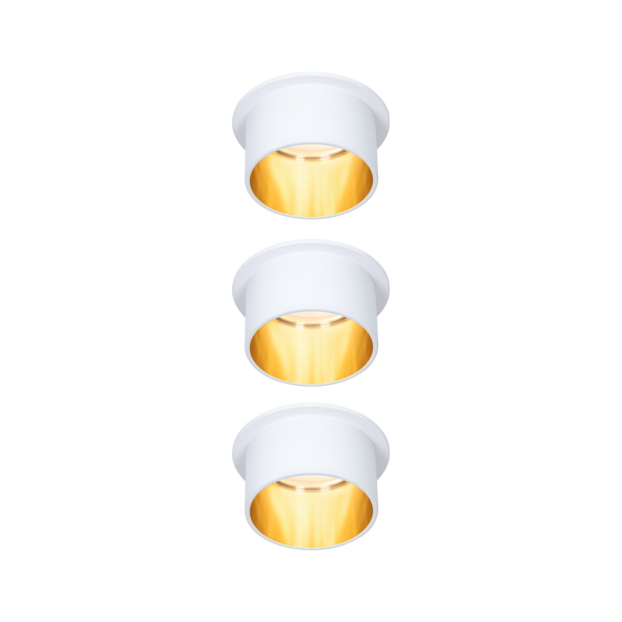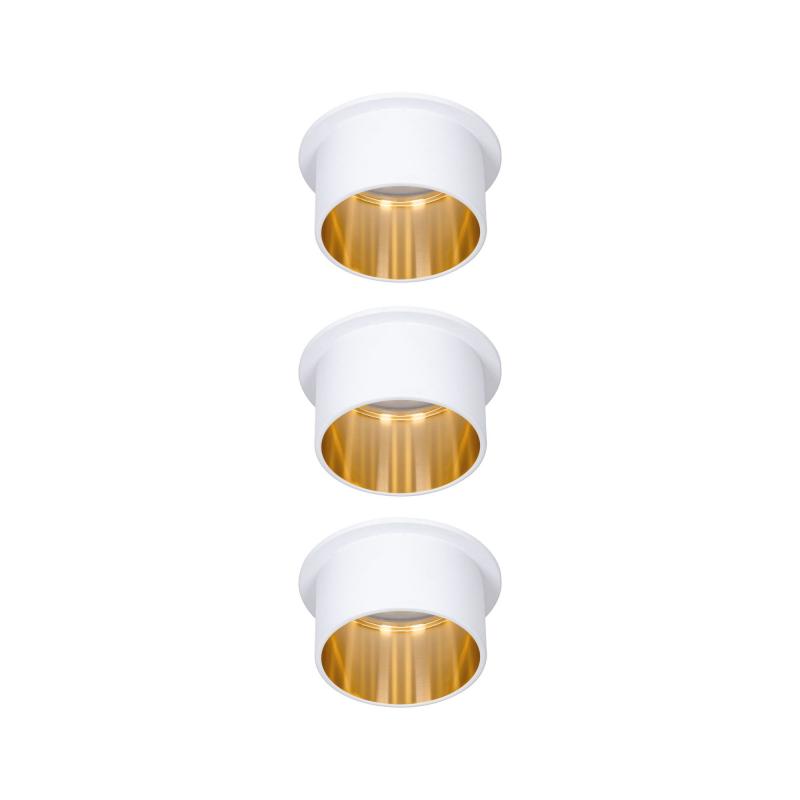 Die dekorativen Einbauleuchten Gil im 3er-Set in der Farbe Weiß matt#Gold sorgen mit ihrem zweifarbigem Design für Lichthighlights und setzen blendfreie Akzente an der Decke. Durch den hervorstehenden Dekozylinder wird eine geringere Einbautiefe im Vergleich zu den zurückgesetzten Lichtpunkten benötigt. Hat man sie entdeckt, möchte man gar nicht mehr wegschauen. Die Strahler punkten mit brillanter Technik: Die wechselbaren LED Coins liefern angenehm warmweißes Licht, lassen sich mit einem herkömmlichen Lichtschalter in drei Stufen dimmen und sind untereinander unendlich verkettbar. Sie benötigen einen Bohrdurchmesser von 62 mm.