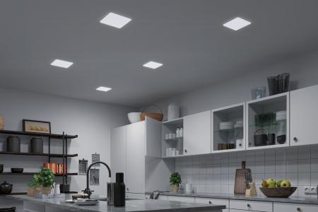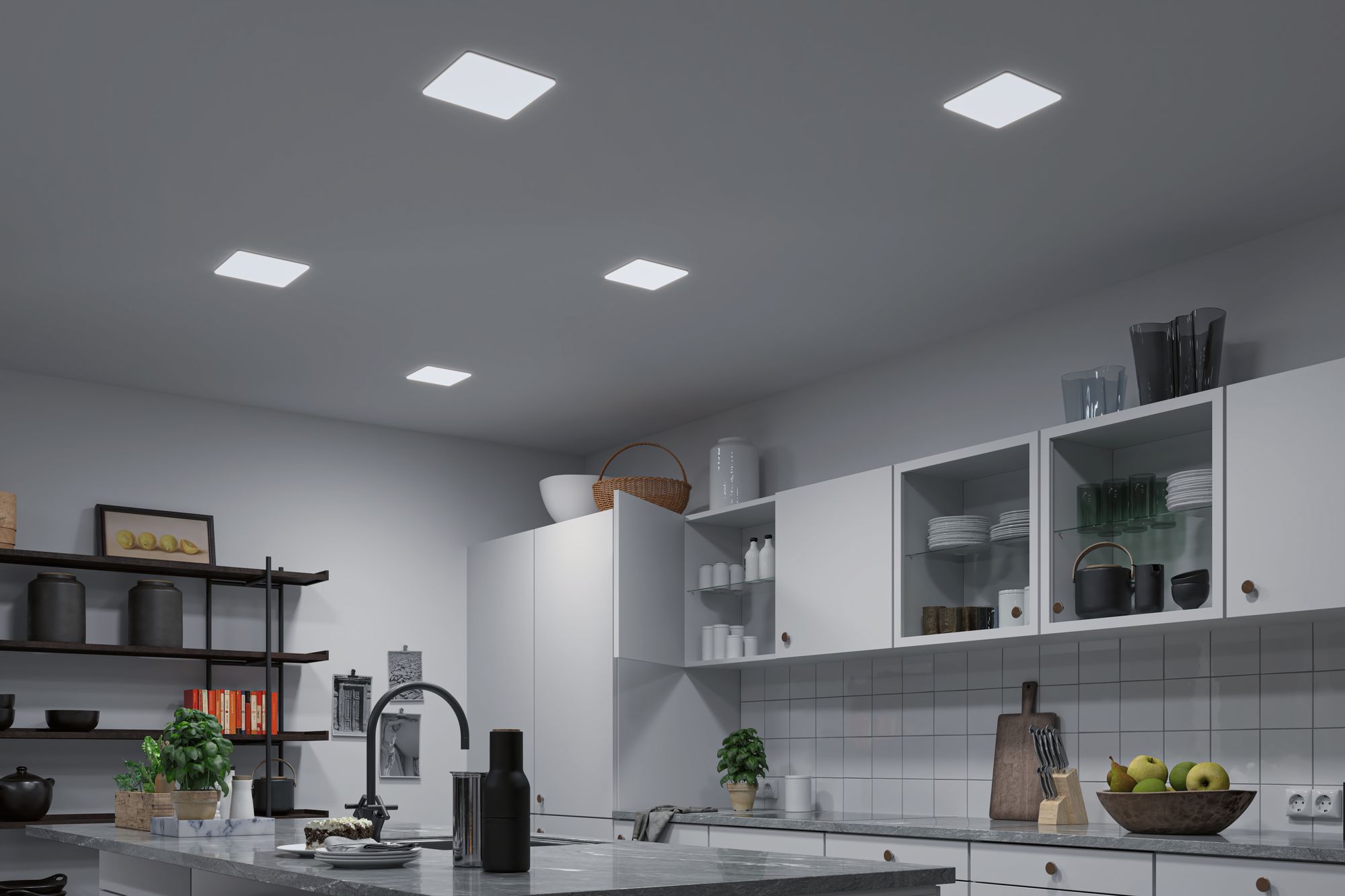 Flexibel einsetzbar wie noch nie! Das Einbaupanel Veluna VariFit in den Maßen 185x185mm besticht durch eine absolut randlose und homogene Lichtfläche. Mit einer superschlanken Aufbauhöhe von nur 10 mm verschmelzt das Panel quasi mit der Decke oder der Wand. Durch den Spritzwasserschutz ist das Panel für den Einsatz im Badezimmer oder Feuchtraum geeignet. Die satinierte Oberfläche der Diffusorplatte sorgt für angenehm flächiges Raumlicht. Die Klemmfedern für den Einbau sind stufenlos auf jede übliche Einbaulochgröße zwischen 45 und 160 mm einstellbar, das erleichtert den Austausch alter Systeme enorm. Das Panel ist mit der WhiteSwitch-Funktion ausgestattet, dadurch lässt sich die Farbtemperatur durch mehrfaches Betätigen des Wandschalters in drei Stufen einstellen.