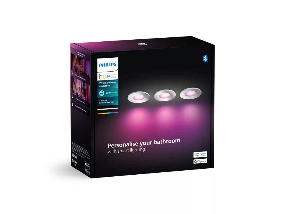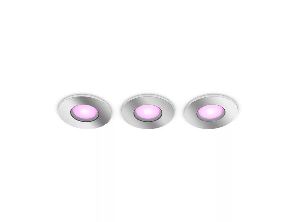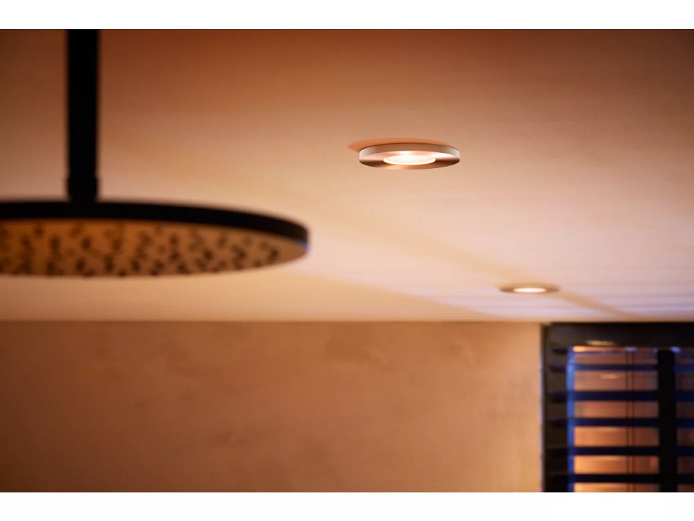 Diese drei Hue Xamento Einbau-Downlights in Silber passen mit ihrem modernen Design, ihrem smartem Licht in Millionen Farben und der Schutzart IP44 in jedes Badezimmer. Bringe Spaß in Deinen Alltag oder dimme das Licht, um Dich zu entspannen.