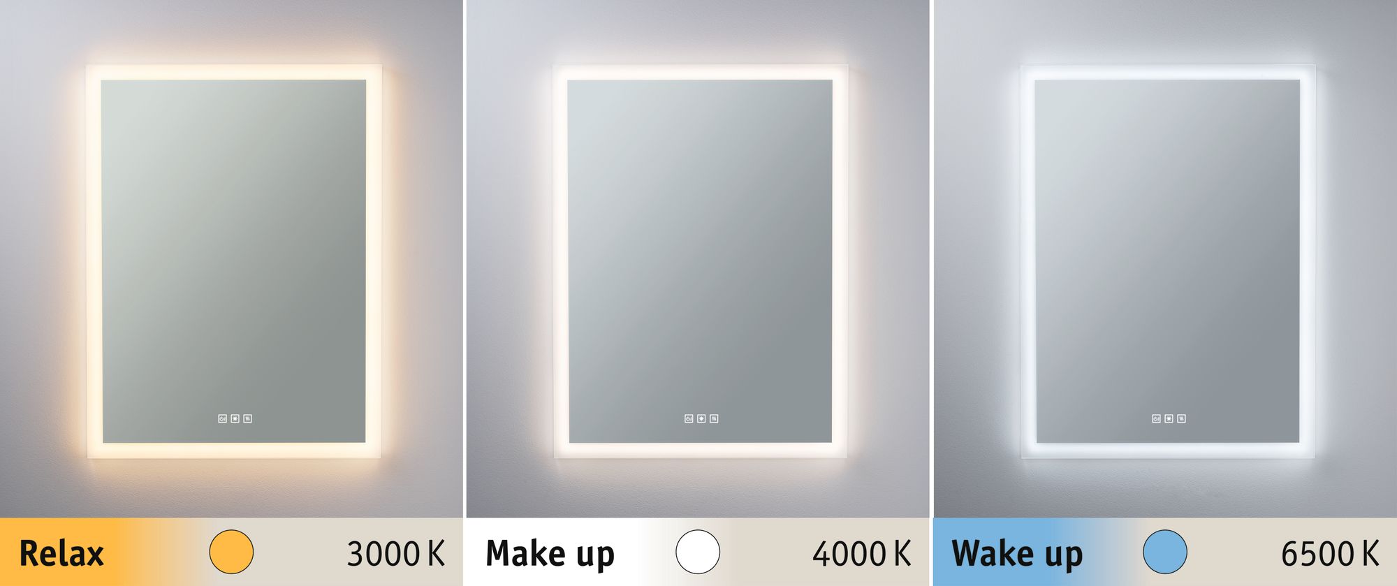 Der eckige Leuchtspiegel Mirra ist durch Spritzwasserschutz für den Einsatz im Badezimmer oder Feuchtraum geeignet. Am Spiegel sind Touch-Schalter zum Ein- und Ausschalten, Einstellen der Lichtfarbe und Heizen vorhanden. Dank der WhiteSwitch-Funktion lässt sich die Lichtfarbe je nach Tageszeit und Bedürfnis einstellen: Tageslichtweiß – Wake up! Neutralweiß – Make up! Warmweiß – Relax! Die Heizfunktion sorgt auch bei Feuchtigkeit für klare Sicht.