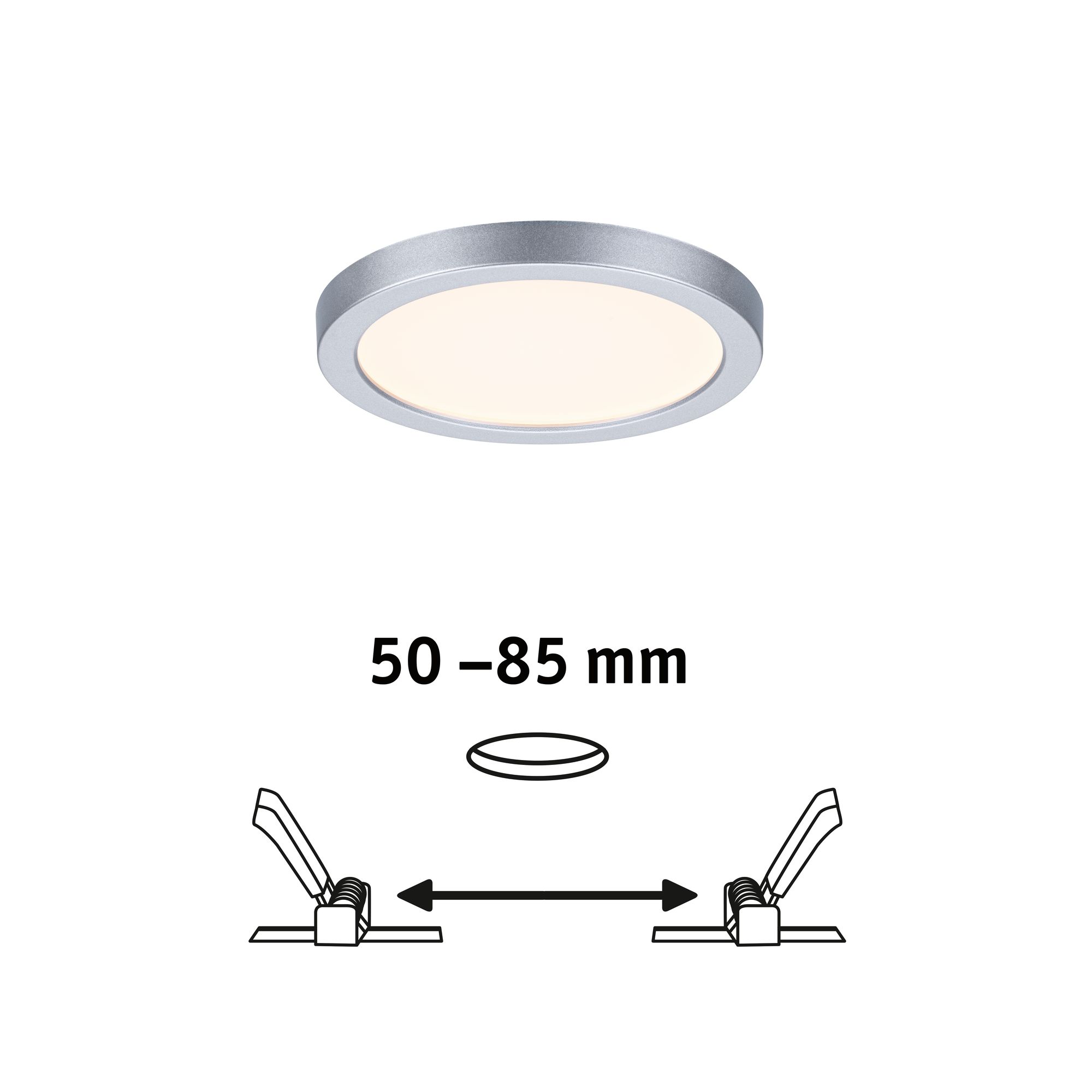 Das runde Einbaupanel Areo mit einem Durchmesser von 118 mm und einer Leistung von 6,5 Watt in Chrom matt sorgt für flächiges warmweißes Licht. Dank flexibler VariFit-Technik lassen Sie sich Klemmfedern für den Einbau stufenlos zwischen 50 und 85 mm einstellen. Damit kann das Panel sowohl in bereits vorhandene Bohrlöcher als auch in neue mit Standard Bohrkrone eingebaut werden.