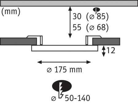 ALLGEMEINE INFORMATIONEN Wohnraum: jeder Wohnraum Form: rund IP Schutz: IP44 Schutzklasse: Schutzklasse II Dimmbar: Ja Dimmen: mit normalem Lichtschalter 3 step dimmbar Technik: LED Energieeffizienzklasse: A++ - A ABMESSUNGEN & GEWICHT Höhe (mm): 12 Gewicht netto (g): 328 Gewicht brutto (g): 422 Ø (mm): 175 Einbauöffnung (mm): 50 Einbautiefe (mm): 70 Hohlraumtiefe (mm): 30-55 LICHTTECHNISCHE DATEN Bestückung (W): 13 Spannung (V): 230 Farbtemperatur Bereich (K): 3000 Lebensdauer (h): 30000 Inklusive Leuchtmittel: Ja Nennlichtstrom (lm): 1300 Farbwiedergabeindex (Ra): > 80 Entspricht Glühlampe: 115 W FARBEN & MATERIALIEN Material: Kunststoff BESONDERHEIT