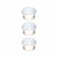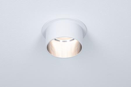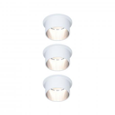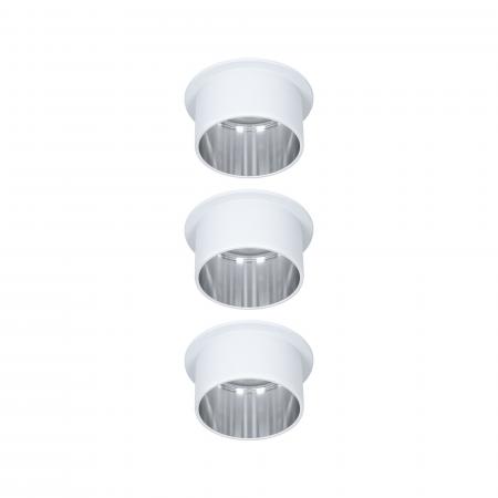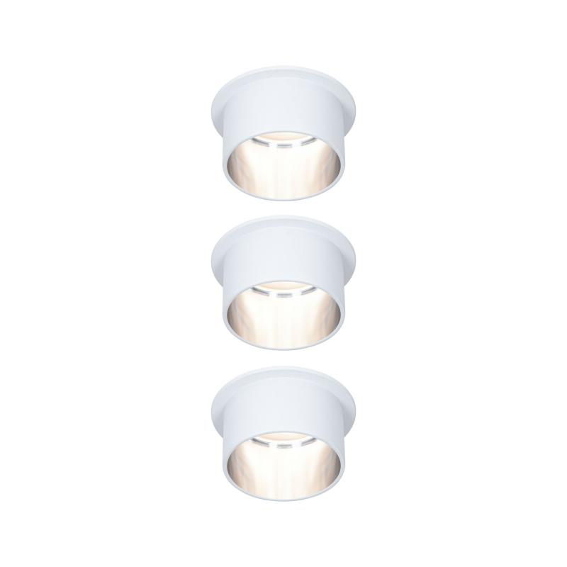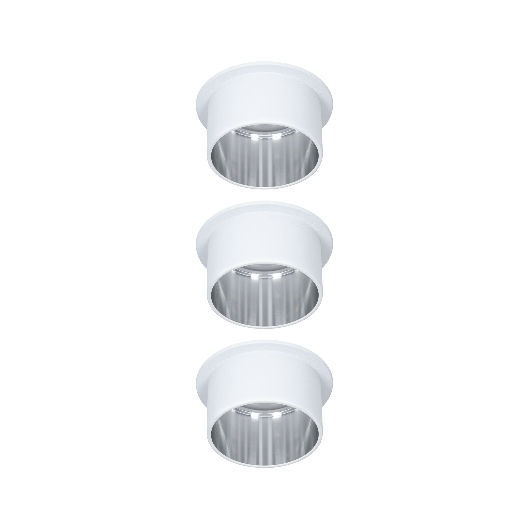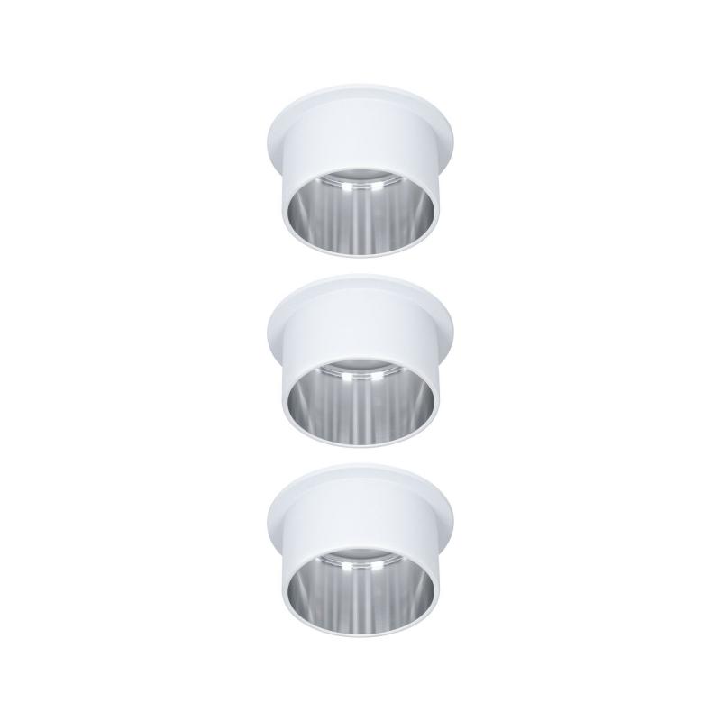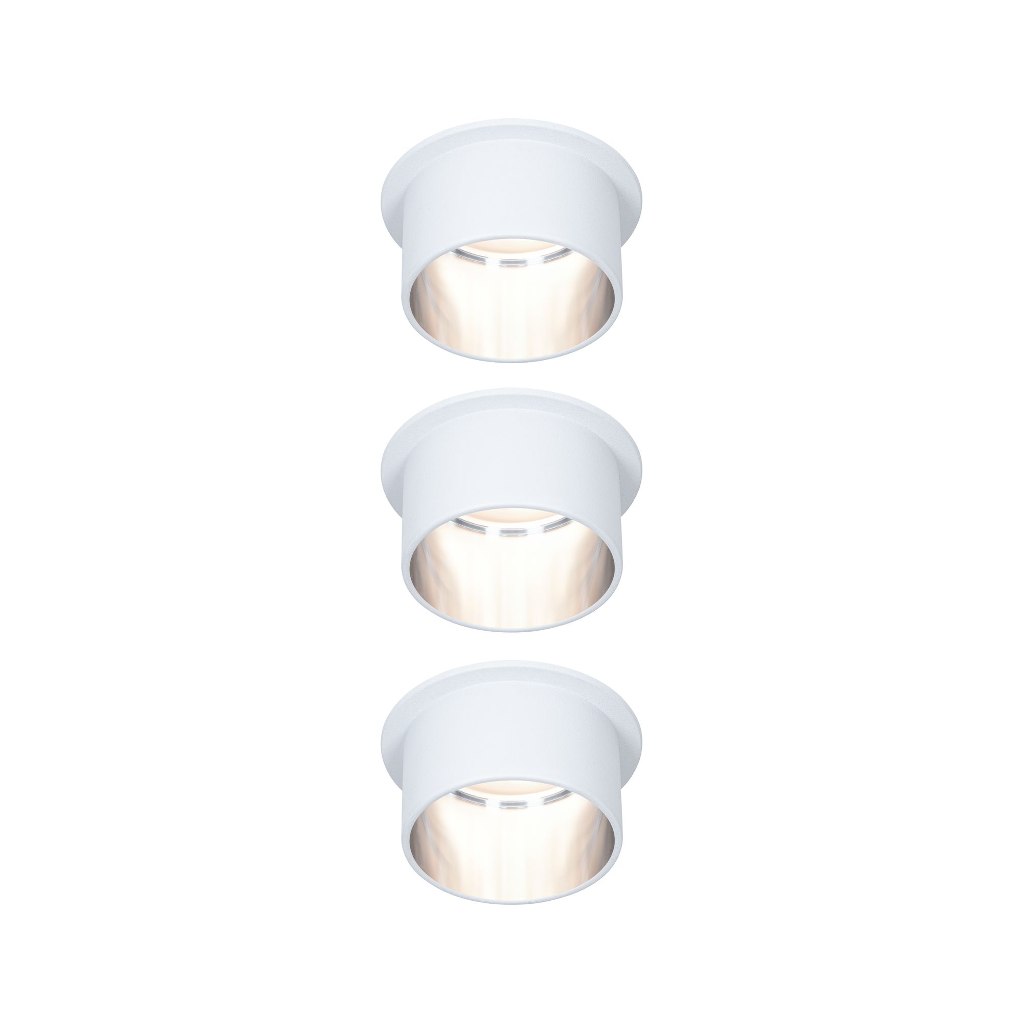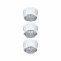 Die dekorativen Einbauleuchten Gil im 3er-Set in der Farbe Weiß matt#Eisen gebürstet sorgen mit ihrem zweifarbigem Design für Lichthighlights und setzen blendfreie Akzente an der Decke. Durch den hervorstehenden Dekozylinder wird eine geringere Einbautiefe im Vergleich zu den zurückgesetzten Lichtpunkten benötigt. Hat man sie entdeckt, möchte man gar nicht mehr wegschauen. Die Strahler punkten mit brillanter Technik: Die wechselbaren LED Coins liefern angenehm warmweißes Licht, lassen sich mit einem herkömmlichen Lichtschalter in drei Stufen dimmen und sind untereinander unendlich verkettbar. Sie benötigen einen Bohrdurchmesser von 62 mm.