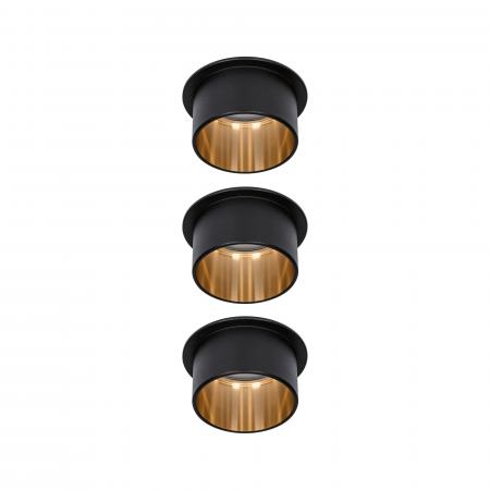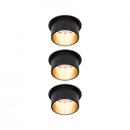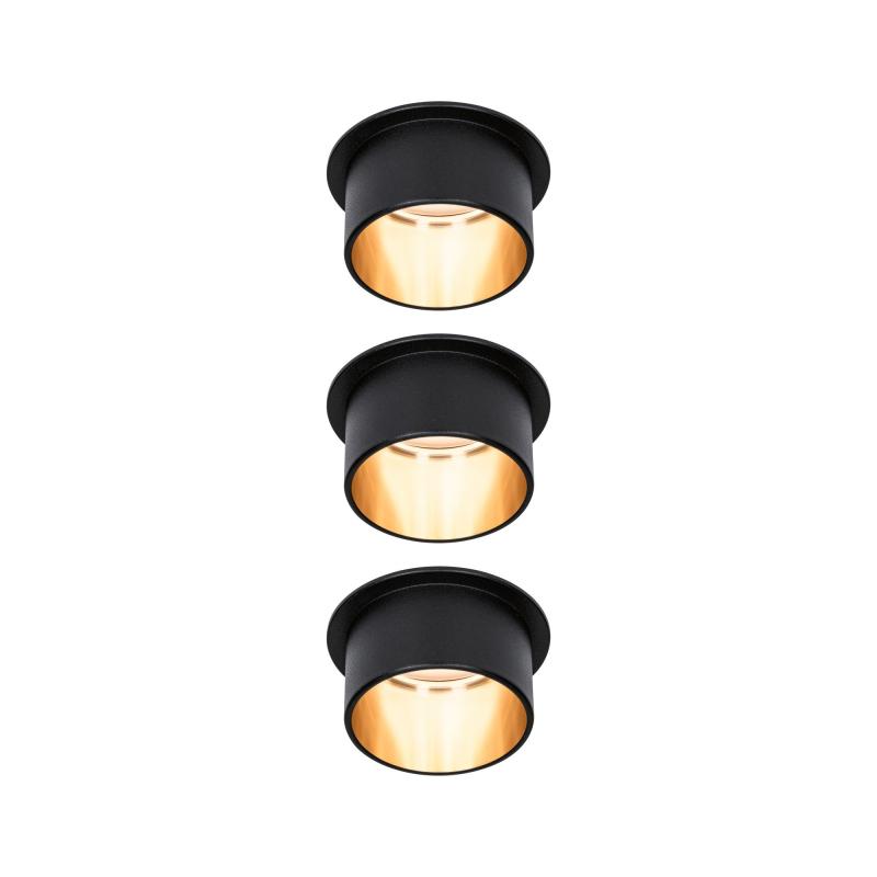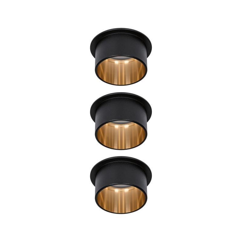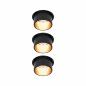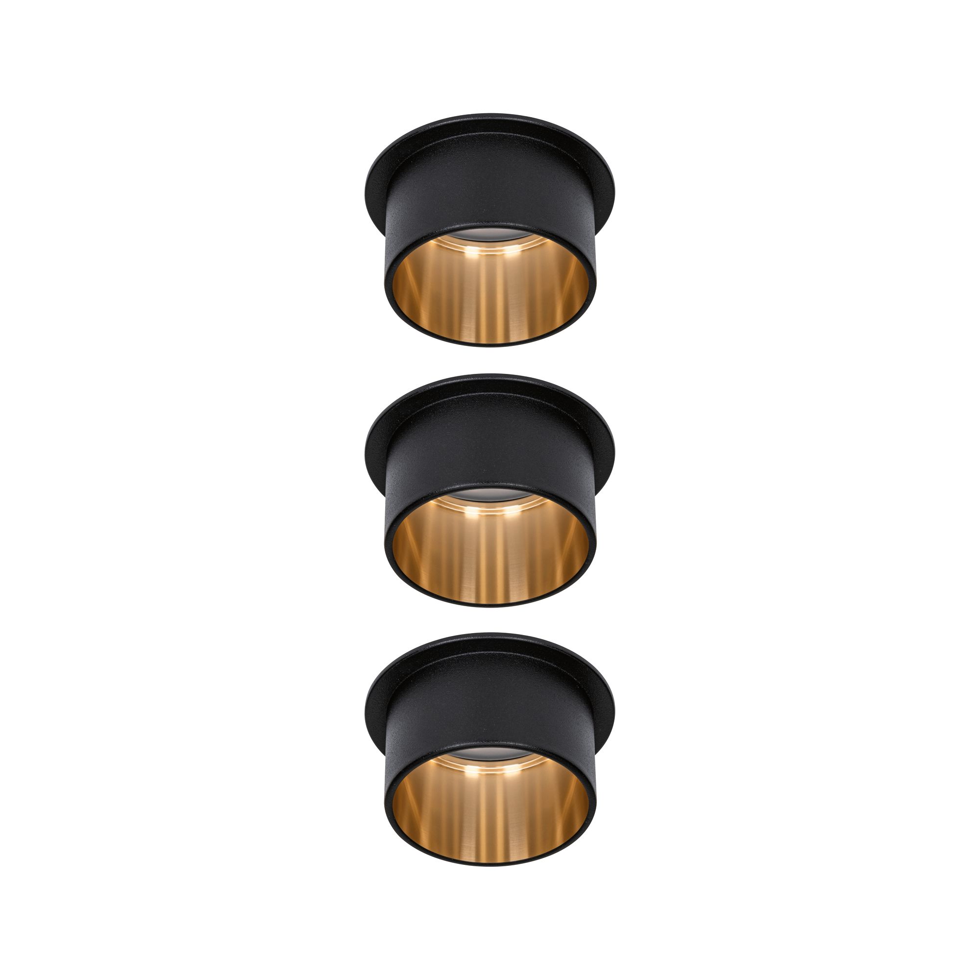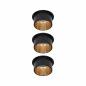 Die dekorativen Einbauleuchten Gil im 3er-Set in der Farbe Schwarz matt Gold sorgen mit ihrem zweifarbigem Design für Lichthighlights und setzen blendfreie Akzente an der Decke. Durch den hervorstehenden Dekozylinder wird eine geringere Einbautiefe im Vergleich zu den zurückgesetzten Lichtpunkten benötigt. Hat man sie entdeckt, möchte man gar nicht mehr wegschauen. Die Strahler punkten mit brillanter Technik: Die wechselbaren LED Coins liefern angenehm warmweißes Licht, lassen sich mit einem herkömmlichen Lichtschalter in drei Stufen dimmen und sind untereinander unendlich verkettbar. Sie benötigen einen Bohrdurchmesser von 62 mm.