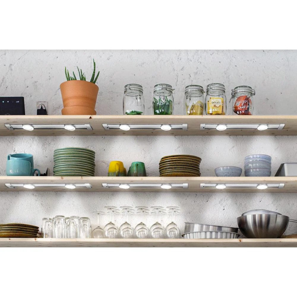 Flache Unterbauleuchte, Magnetschiene für flexible Spotmontage. Produkteigenschaften: Farbtemperatur: 4.000 K. Produktvorteile: Einfaches und schnelles Anreihen dank einfachem Stecksystem. Klares modernes Design. Anwendungsgebiete: Regalunterbaubeleuchtung. Nur für Innenraumbeleuchtung. Regal- und Unterbaubeleuchtung. Küchen, Arbeitsbereiche. Regale. Technische Ausstattung: Vollständiges Montage- und Anschlusszubehör enthalten. Sicherheitshinweise: Das Gerät ist kein Spielzeug und darf nicht unbeaufsichtigt in die Hände von Kindern gelangen oder von Kindern betrieben werden.. Nicht geeignet zur Raumbeleuchtung im Haushalt.. Um die Gefahr einer Strangulierung zu verringern, muss die an der Leuchte angeschlossene flexible Zuleitung, sofern sich diese in Armreichweite befindet, direkt und fest an der Wand montiert werden.